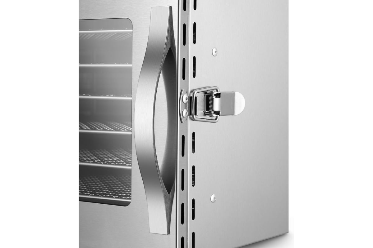 В сушилке установлен нагревательный элемент, а также вентилятор, обеспечивающий равномерное распределение нагретого воздуха по всему объему камеры. Благодаря горизонтальному обдуву смешение запахов при сушке одновременно разных продуктов минимально.
