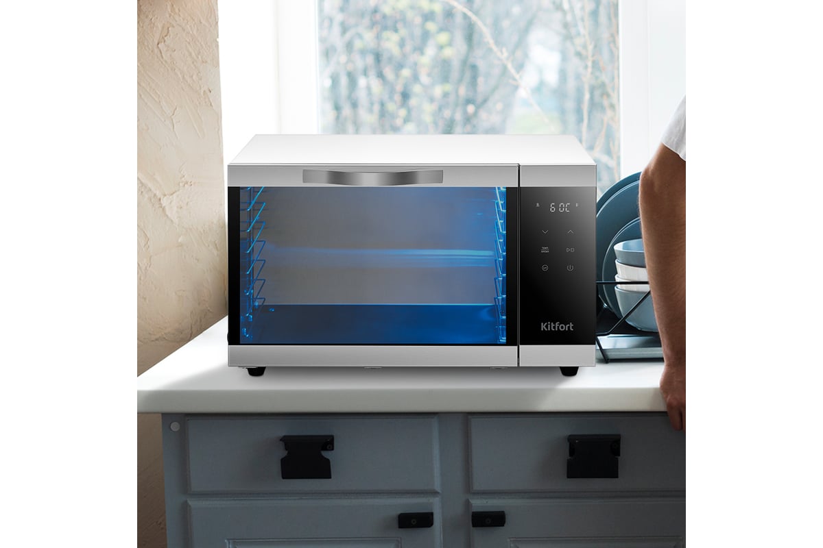 В сушилке установлен мощный нагревательный элемент, а также вентилятор, обеспечивающий равномерное распределение нагретого воздуха по всему объему камеры. Благодаря горизонтальному обдуву смешение запахов при сушке одновременно разных продуктов минимально.