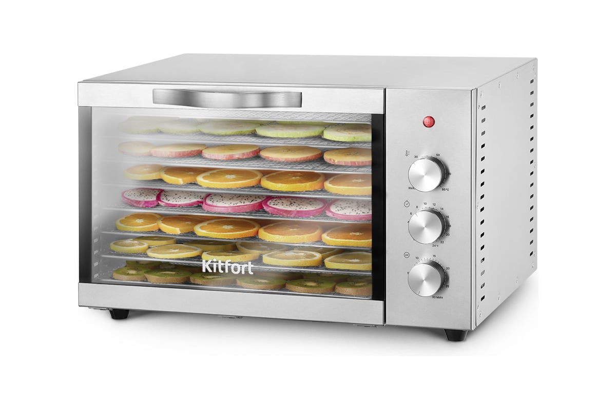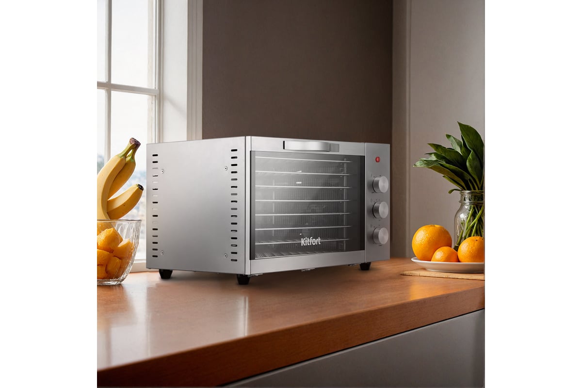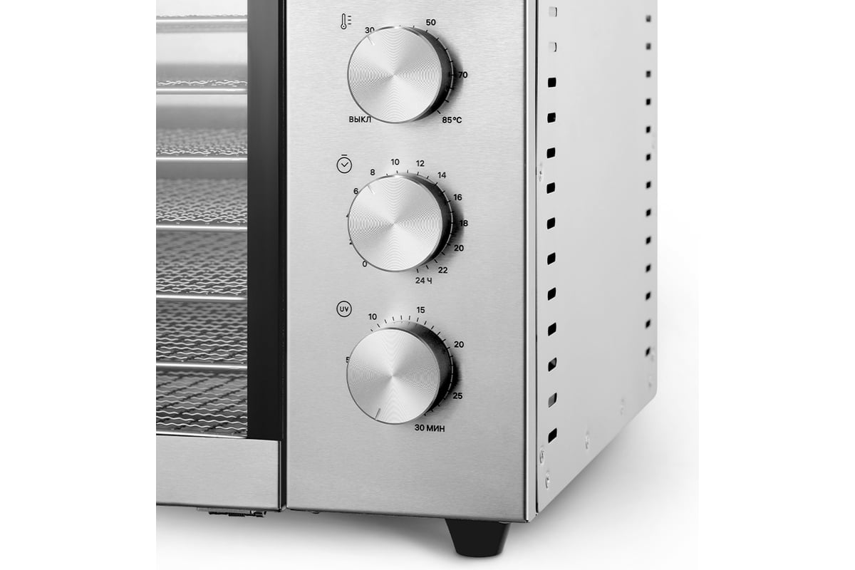В сушилке установлен нагревательный элемент, а также вентилятор, обеспечивающий равномерное распределение нагретого воздуха по всему объему камеры. Благодаря горизонтальному обдуву смешение запахов при одновременной сушке разных продуктов минимально.