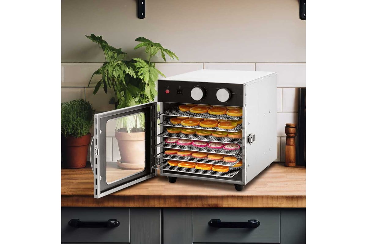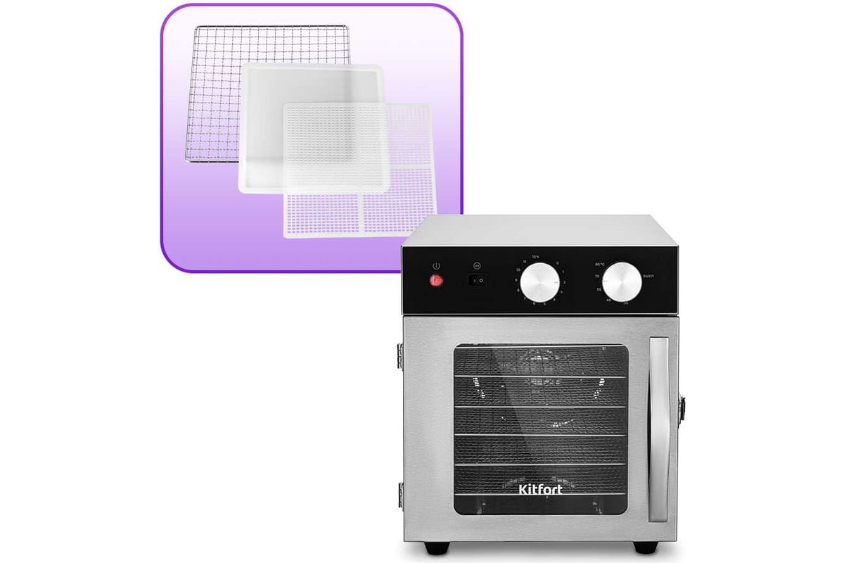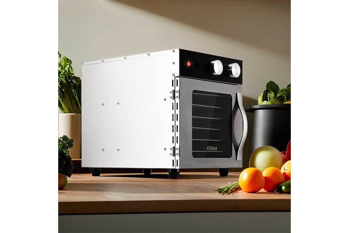 Электрическая сушилкаKT-1986 предназначена для сушки овощей, фруктов, ягод, грибов, корнеплодов, трав и зелени, хлеба, а также мяса и рыбы. С помощью специальных сплошных поддонов можно готовить пастилу.