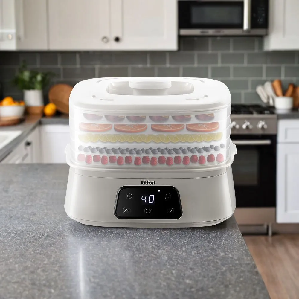 С электрической сушилкой Kitfort KT-1991 у вас под рукой будет всегда живая еда. Прибор насушит на зиму фрукты, овощи, ягоды, грибы, корнеплоды, зелень, хлеб и многое другое. Это не только вкусно, но и полезно!