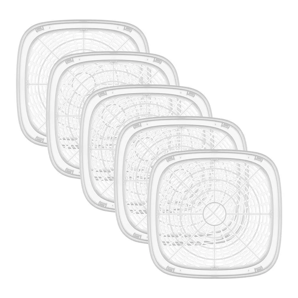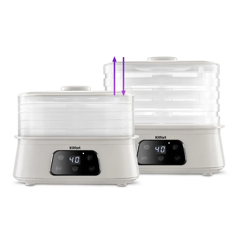 Устанавливайте от 1 до 5 поддонов друг на друга. 5 регулируемых по высоте съёмных поддонов позволяют разместить в небольшом объёме максимум продуктов и добиться их наилучшего распределения для быстрого и равномерного высушивания.