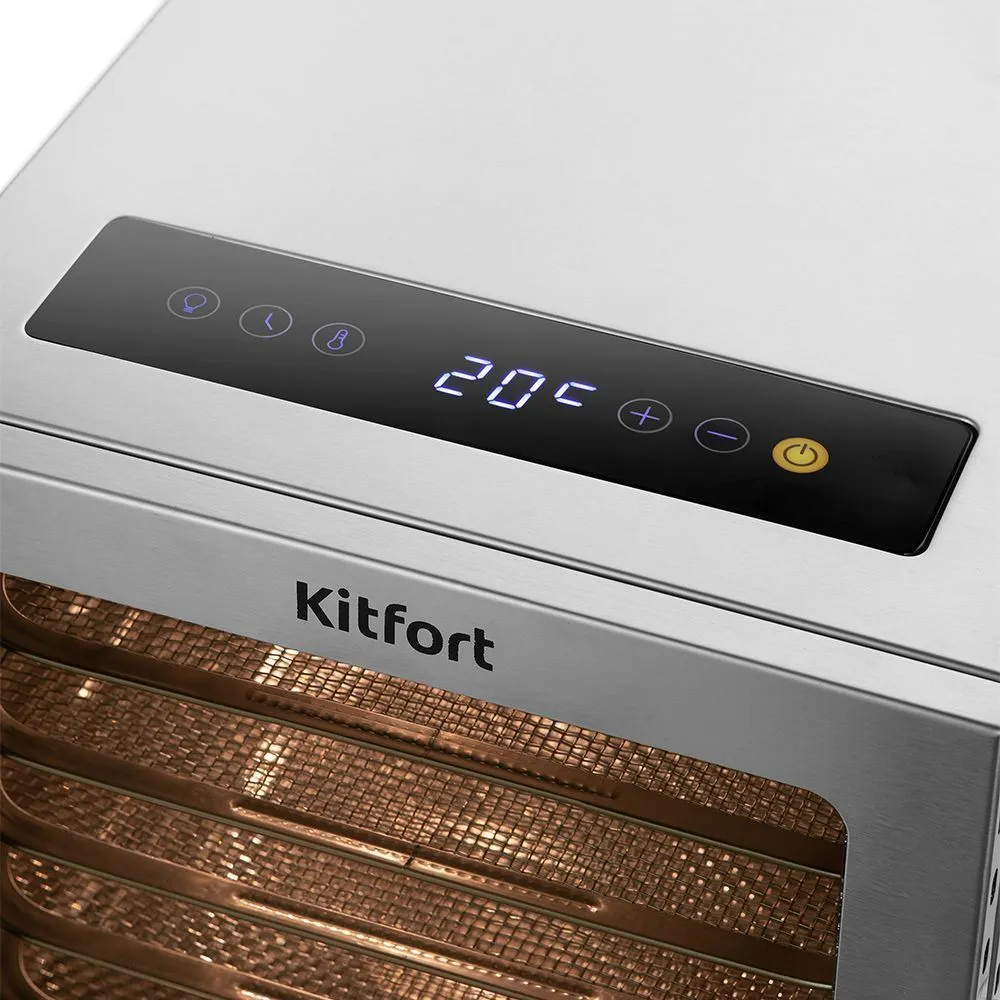 На сушилки для овощей и фруктов КТ-1998 можно установить температуру в диапазоне от 20 до 90 °С с шагом 5 °С. Сушилка оснащена таймером до 24 часов работы с шагом 30 минут.