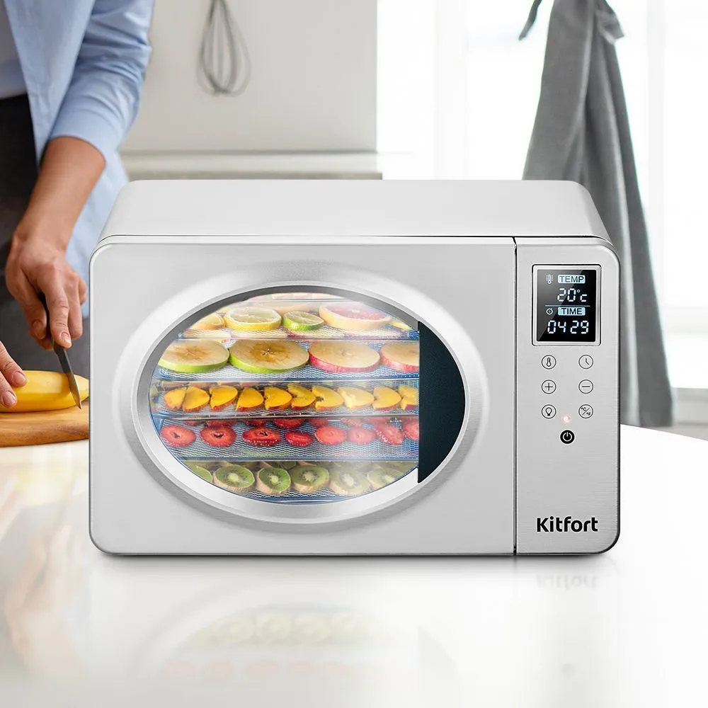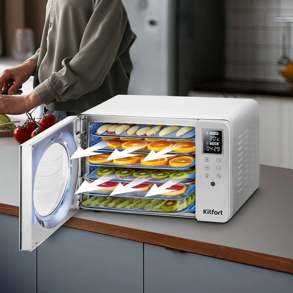 Электрическая сушилка предназначена для сушки овощей, фруктов, ягод, грибов, корнеплодов, трав и зелени, а также мяса и рыбы, хлеба. С КТ-4901 у вас под рукой будет всегда живая еда!