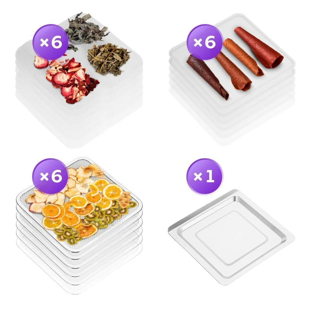 Сушилка имеет в комплекте 6 металлических поддонов, 6 сеток для мелких продуктов и 6 силиконовых сплошных поддонов. Также в комплект входит 1 поддон для жидкости, который облегчает очистку устройства.