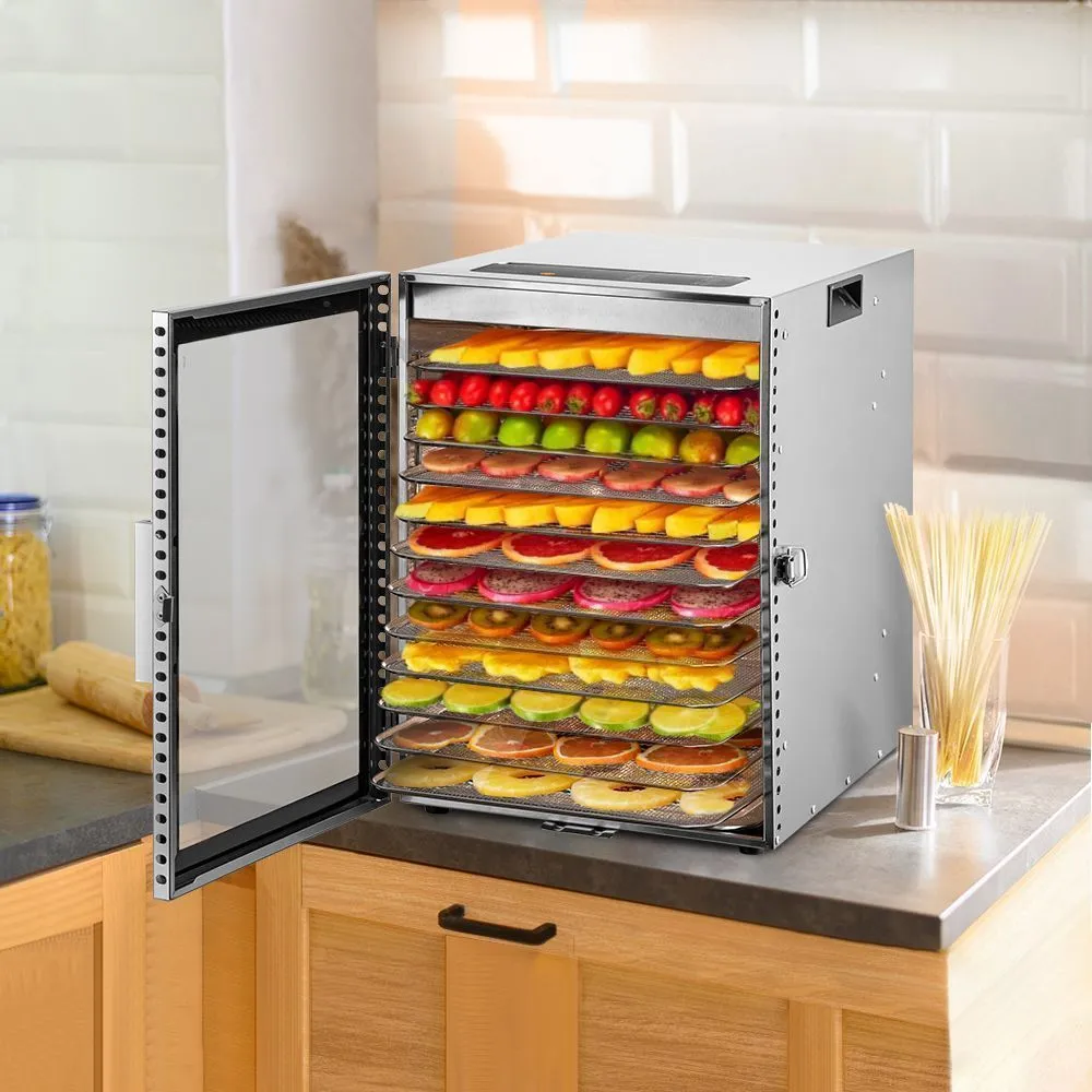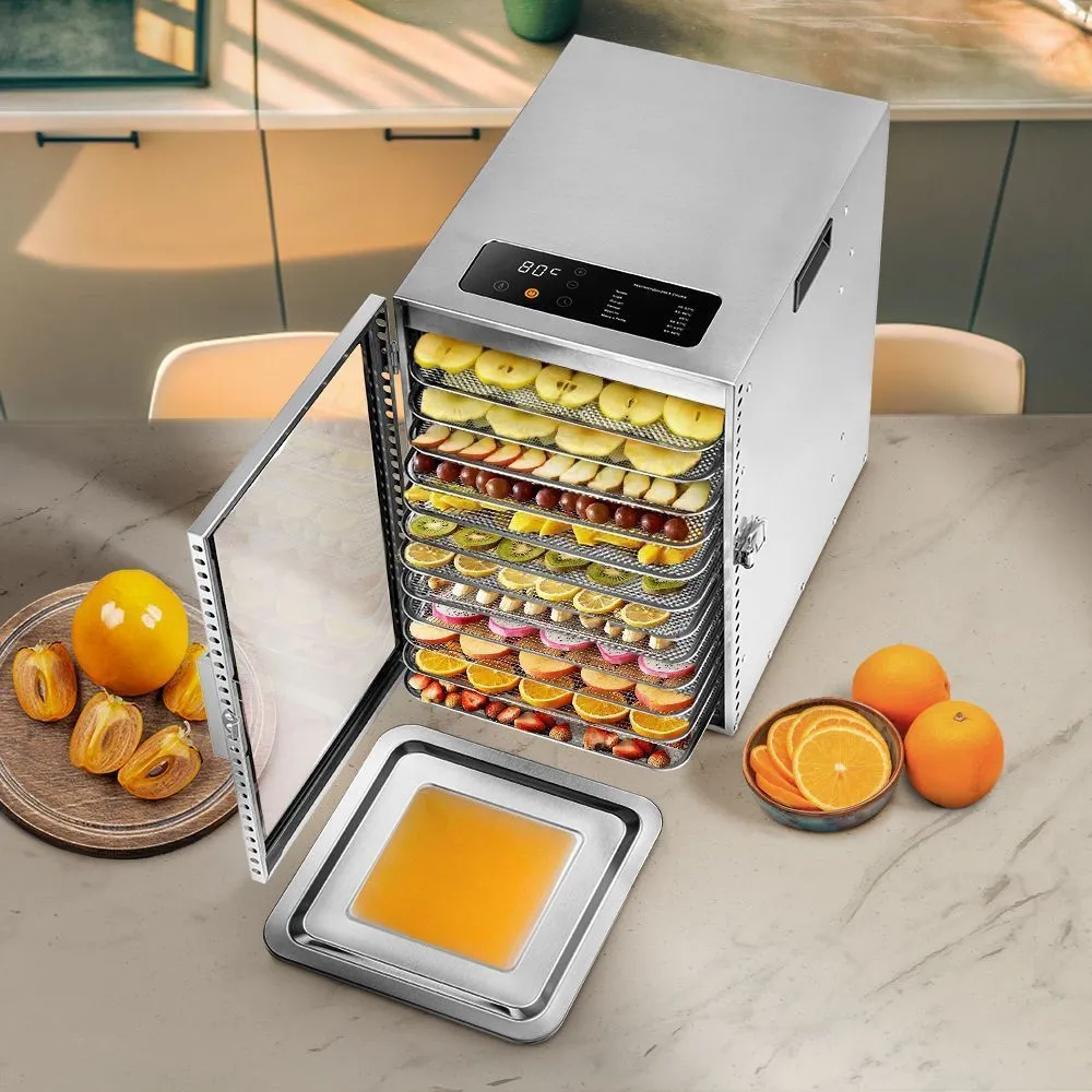 Сушилка оснащена 12 металлическими поддонами, 12 сетками и 12 сплошными поддонами. Металлические поддоны подходят для большинства типов продуктов. Сетки используются для небольших продуктов. Сплошные поддоны служат для сушки водянистых продуктов.