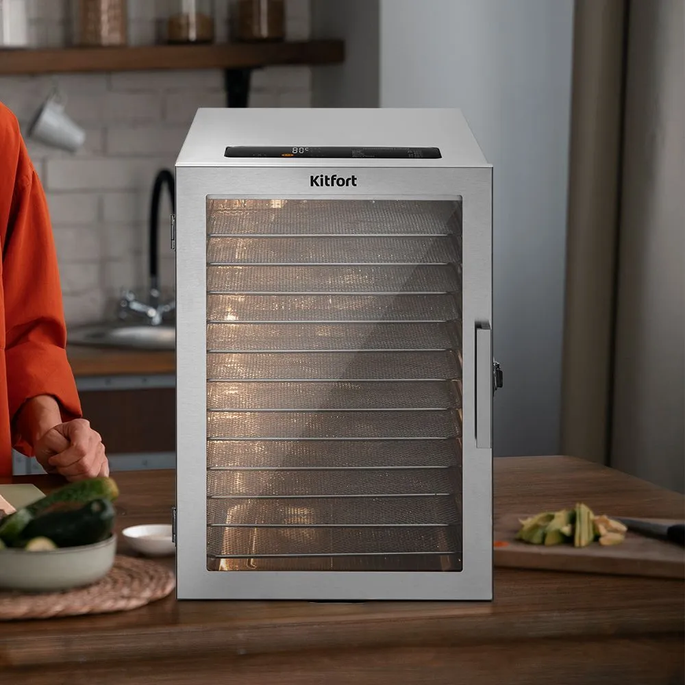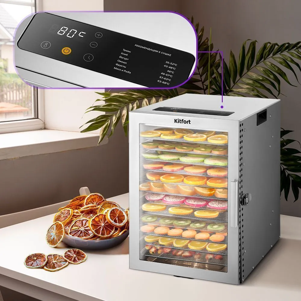 Электрическая сушилка Kitfort КТ-4905 сохранит любимые фрукты и овощи полезными круглый год! Она предназначена для сушки овощей, фруктов, ягод, грибов, корнеплодов, трав и зелени, а также мяса и рыбы, хлеба.