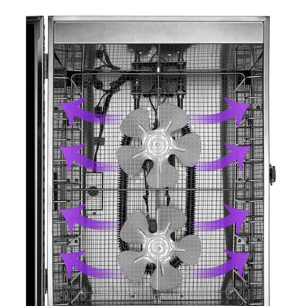 В сушилку установлен мощный нагревательный элемент и 2 вентилятора, обеспечивающих равномерное распределение нагретого воздуха по всему объёму камеры. Благодаря горизонтальному обдуву смешение запахов при сушке одновременно разных продуктов минимально.