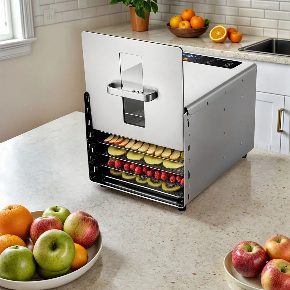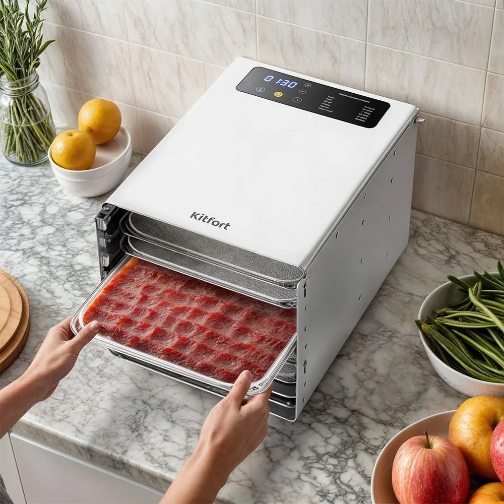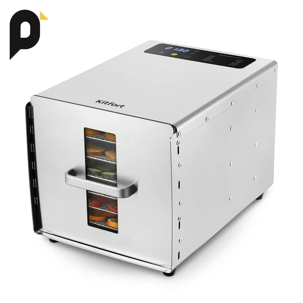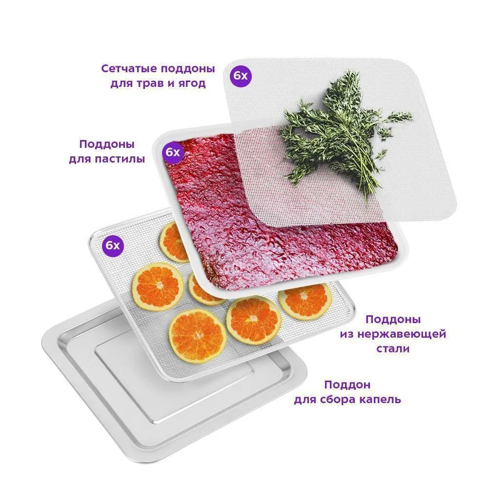 Сушилка имеет в комплекте 6 металлических поддонов, которые подходят для большинства типов продуктов, 6 сеток для мелких продуктов, таких как травы и ягоды и 6 силиконовых сплошных поддонов для пастилы. Также в комплект входит 1 поддон для жидкости.