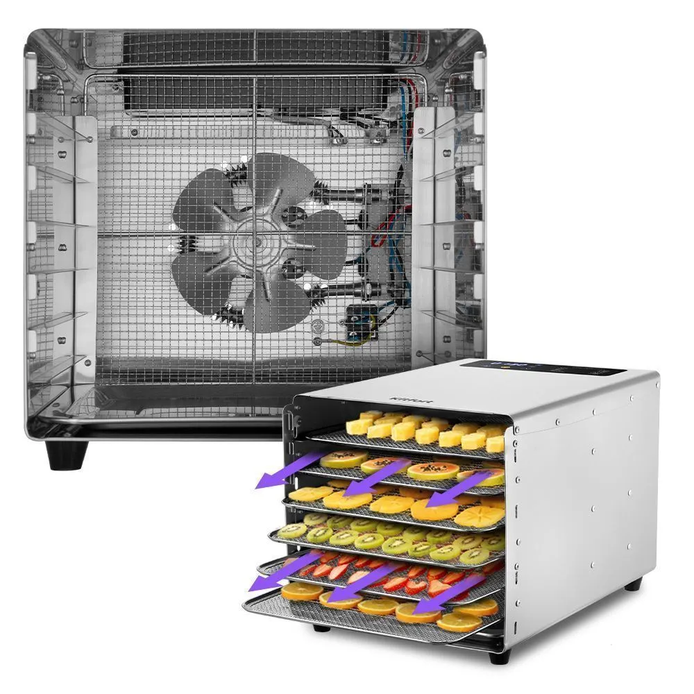 В сушилку установлен мощный нагревательный элемент и вентилятор, обеспечивающий равномерное распределение нагретого воздуха по всему объёму камеры. Благодаря горизонтальному обдуву смешение запахов при одновременной сушке разных продуктов минимально.