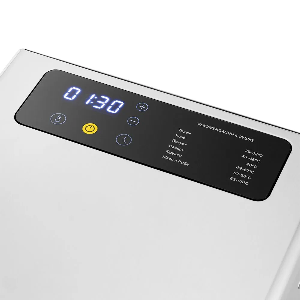 Температуру сушки можно изменить от 20 до 90 °С с шагом 5 °С. Сушилка оснащена таймером до 24 часов работы с шагом 30 минут.