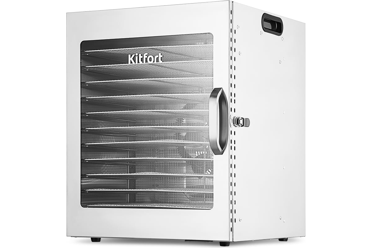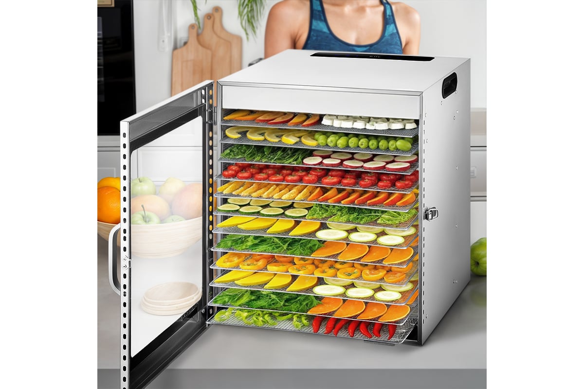 Сушилка имеет в комплекте 12 металлических поддонов, 12 сеток для мелких продуктов и 12 силиконовых сплошных поддонов. Также в комплект входит 1 поддон для жидкости, который облегчает очистку устройства: на поддон попадают остатки от продуктов и сок, после чего поддон легко достать и очистить, а дно камеры сушилки остается чистым.