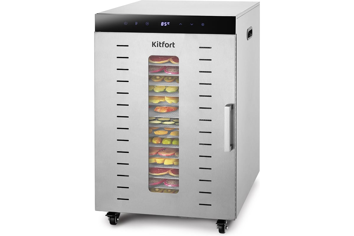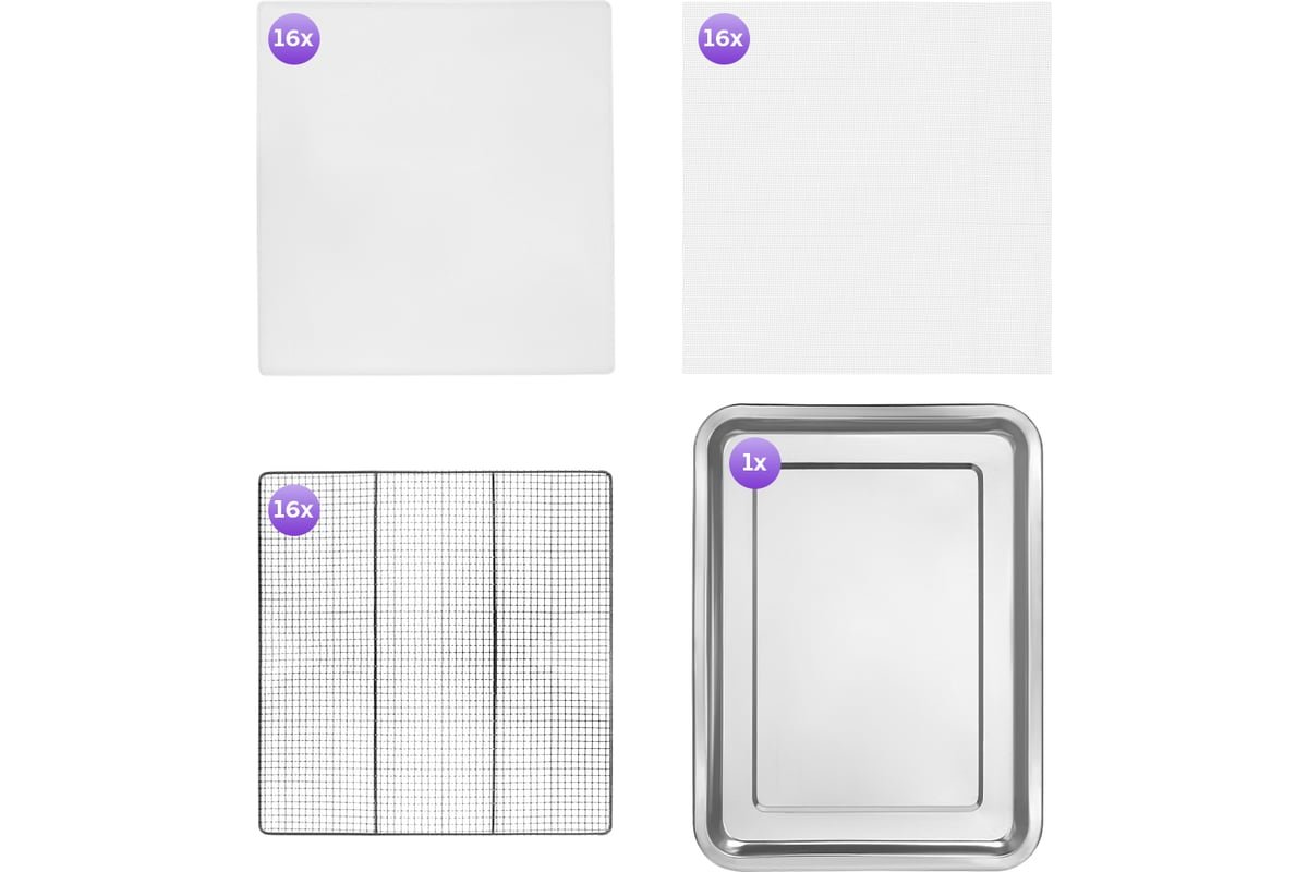 Сушилка имеет в комплекте 16 металлических поддонов, 16 сеток для мелких продуктов и 16 силиконовых сплошных поддонов. Также в комплект входит 1 поддон для жидкости, который облегчает очистку устройства: на поддон попадают остатки от продуктов и сок, после чего поддон легко достать и очистить, а дно камеры сушилки остается чистым.