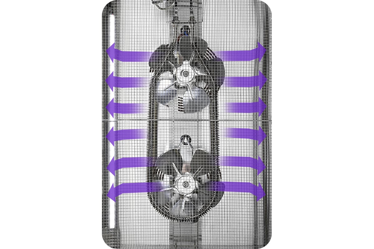 В сушилку установлен мощный нагревательный элемент и два вентилятора, обеспечивающих равномерное распределение нагретого воздуха по всему объему камеры. Благодаря горизонтальному обдуву смешение запахов при одновременной сушке разных продуктов минимально.