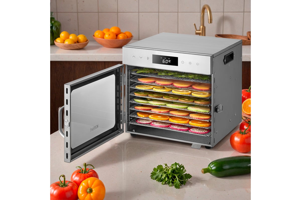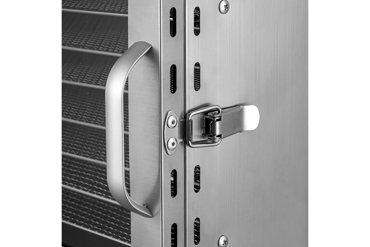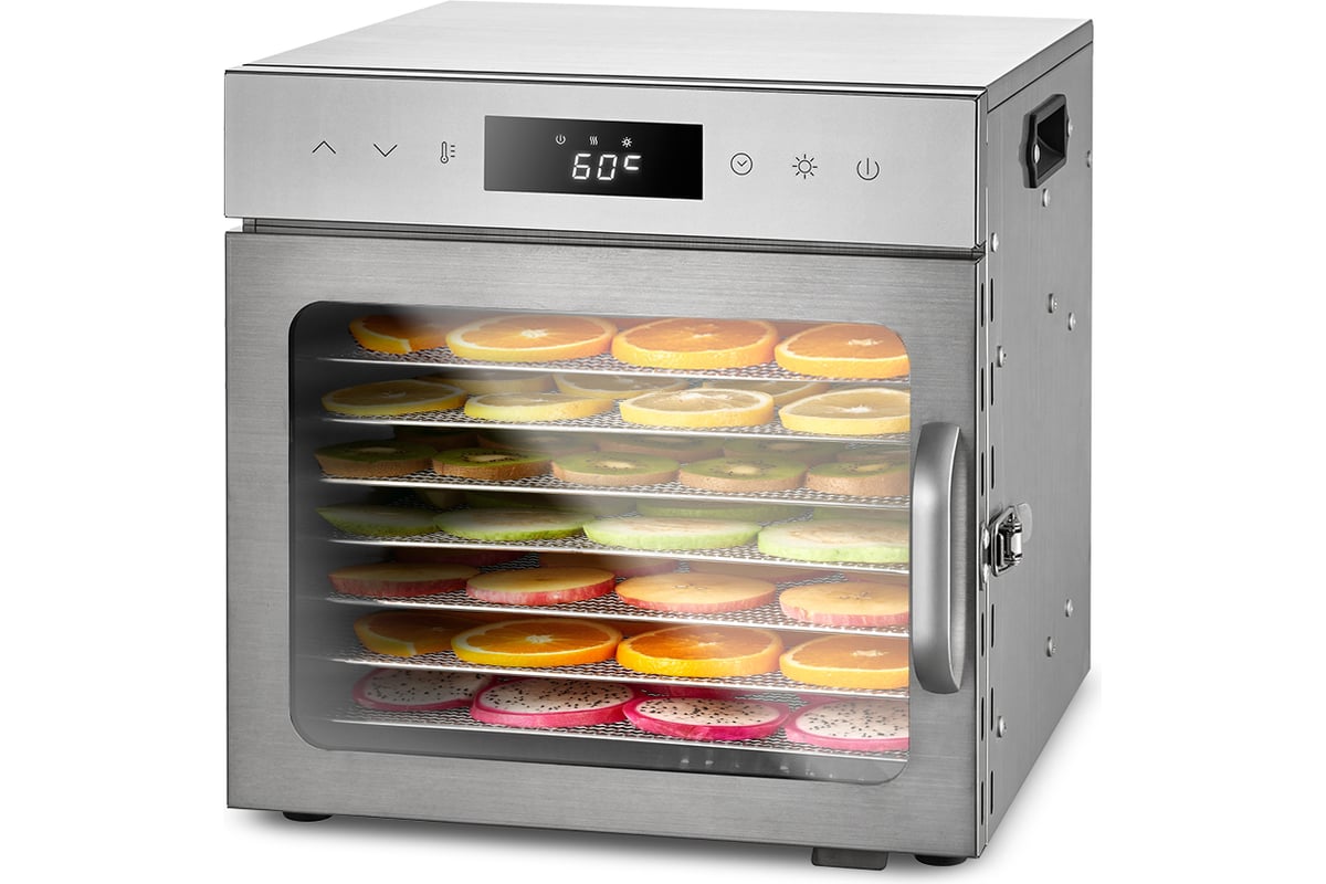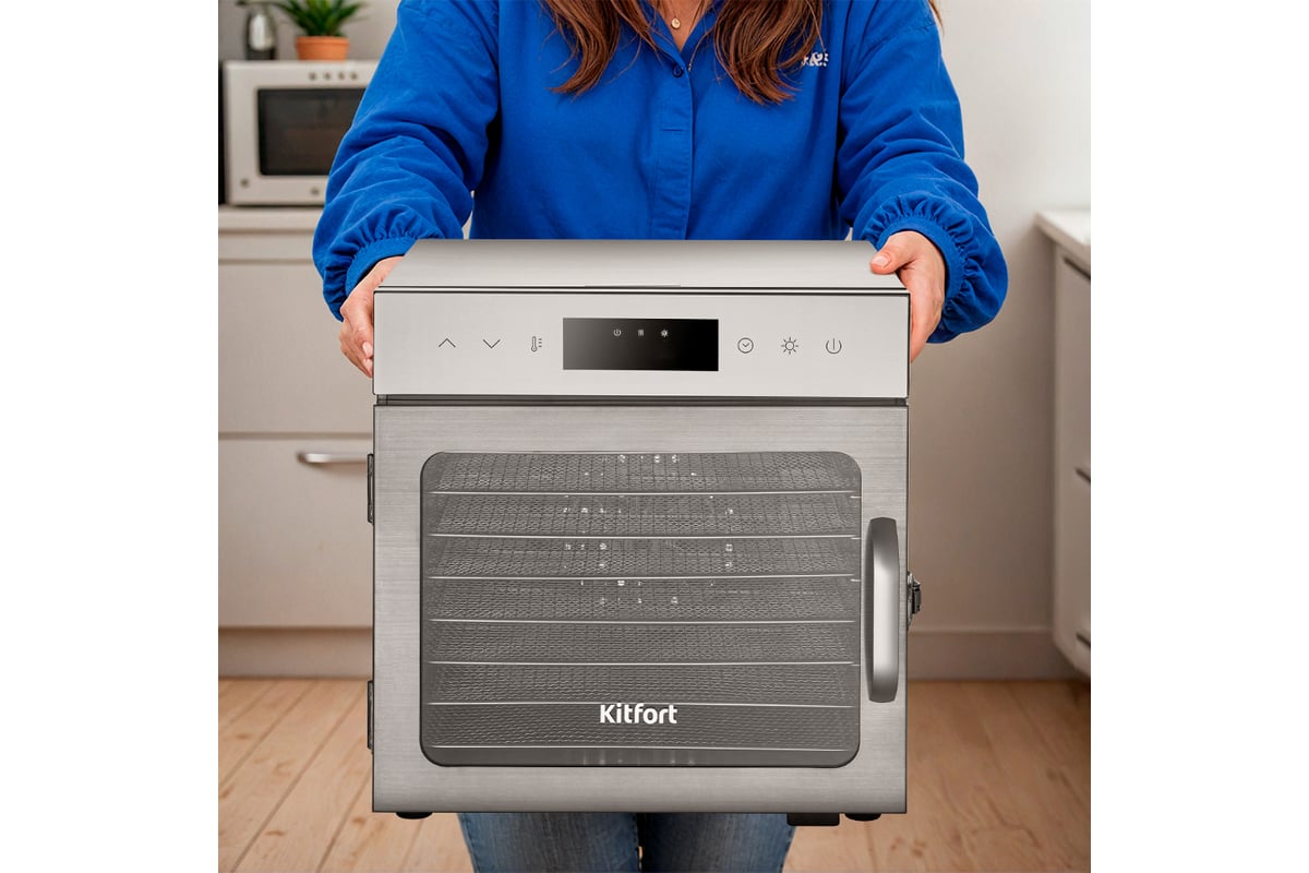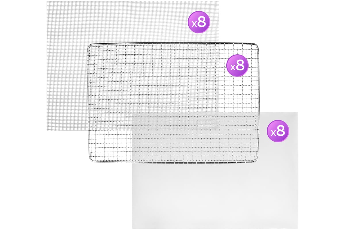 Сушилка имеет в комплекте 8 металлических сетчатых поддонов, 8 силиконовых сплошных поддонов и 8 сеток.