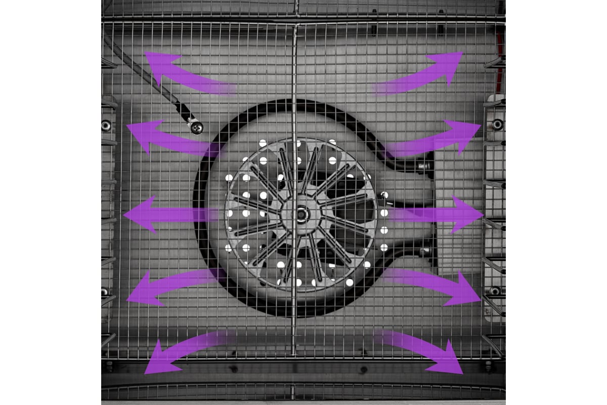 В сушилку установлен мощный нагревательный элемент и вентилятор, обеспечивающий равномерное распределение нагретого воздуха по всему объему камеры. Благодаря горизонтальному обдуву смешение запахов при одновременной сушке разных продуктов минимально.