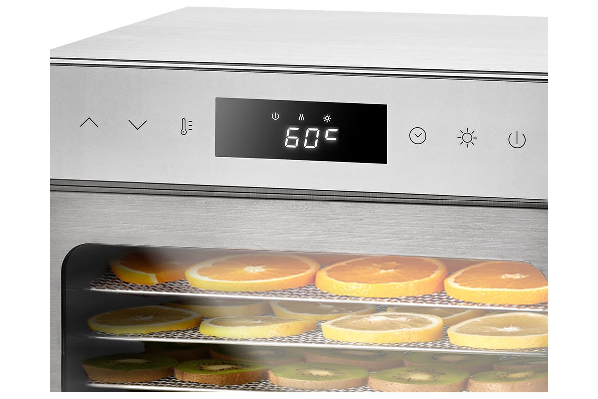 Температуру сушки можно изменить от 30 до 90 °С с шагом 5 °С. Сушилка оснащена таймером от 30 минут до 24 часов работы с шагом 30 минут.