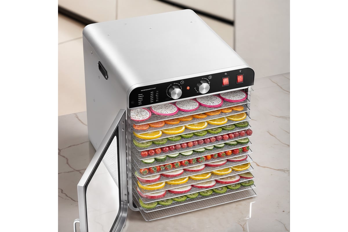 В комплекте есть 12 металлических поддонов, 12 силиконовых сплошных поддонов и 12 сеток. Температуру сушки можно изменить от 30 до 90 °С. Сушилка оснащена таймером до 12 часов. Внутри камеры можно включить подсветку.