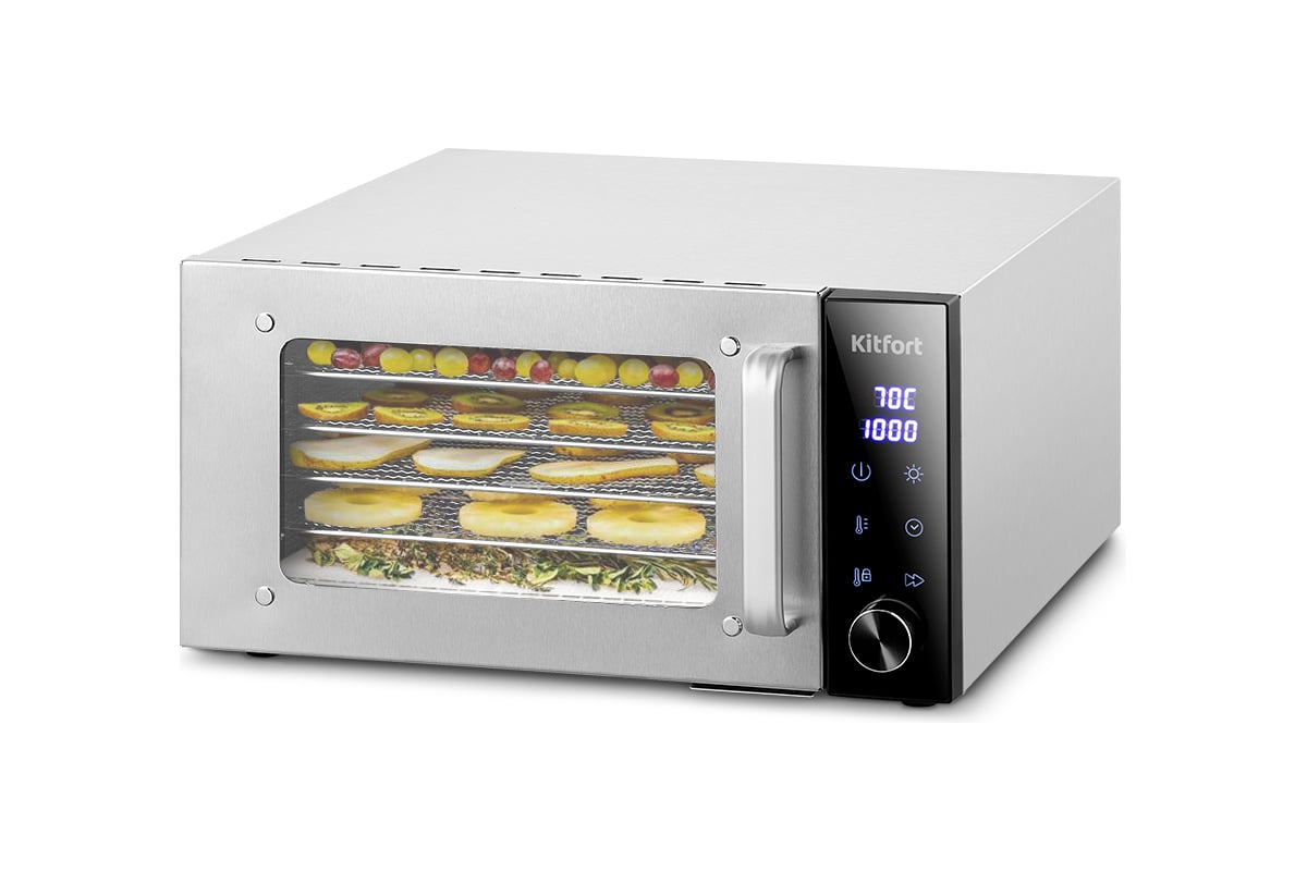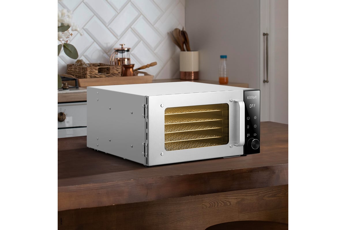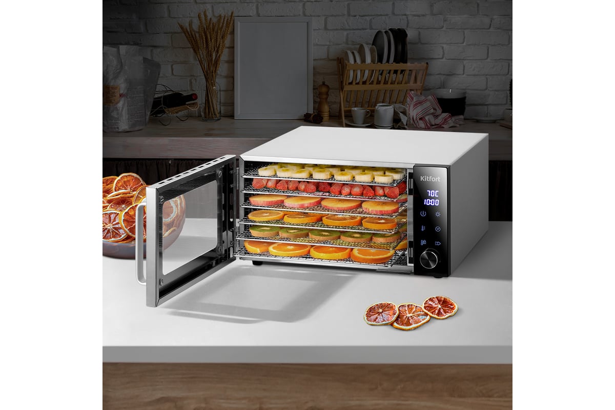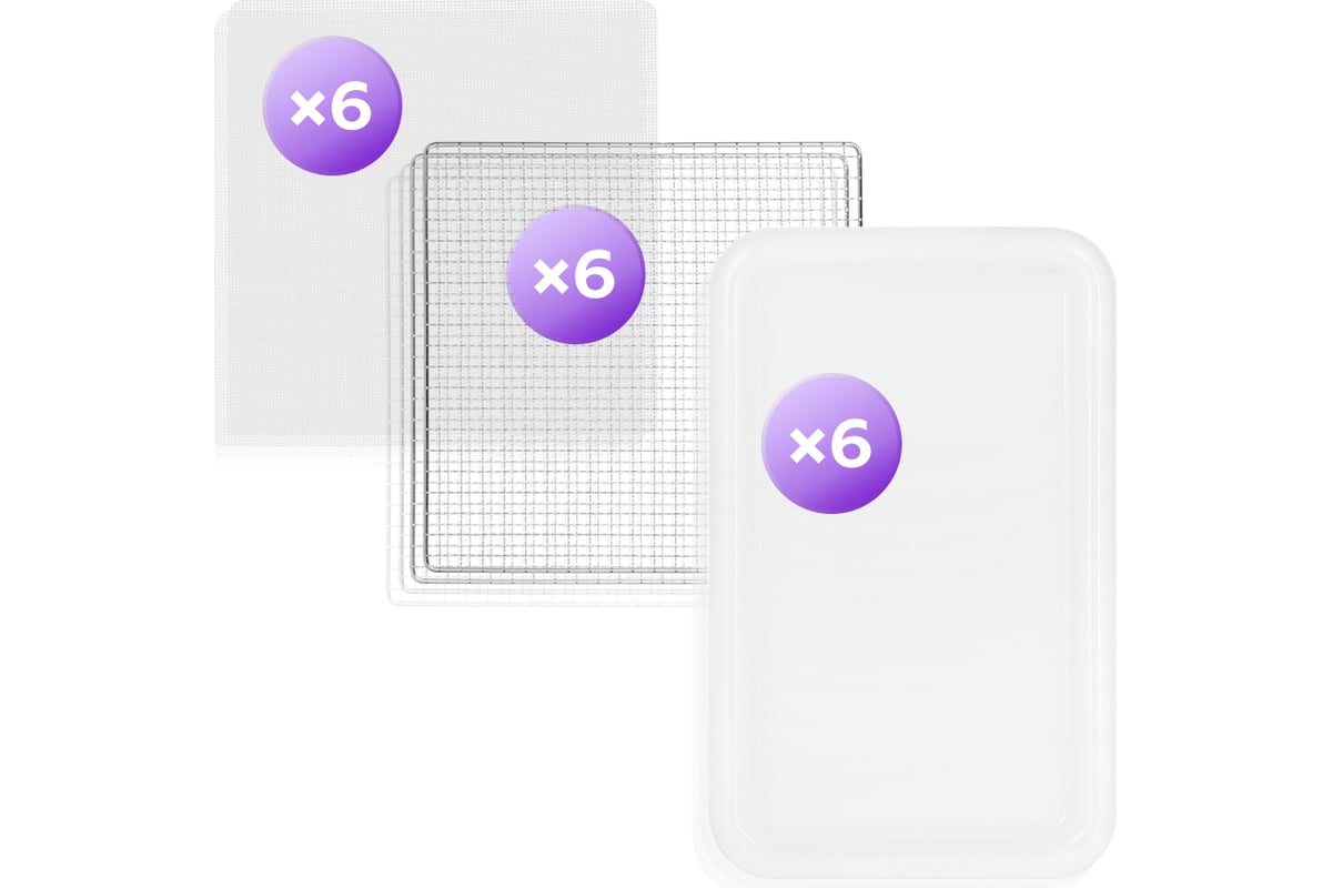 Сушилка имеет в комплекте 6 металлических сетчатых поддонов, 6 пластиковых сплошных поддонов и 6 сеток.