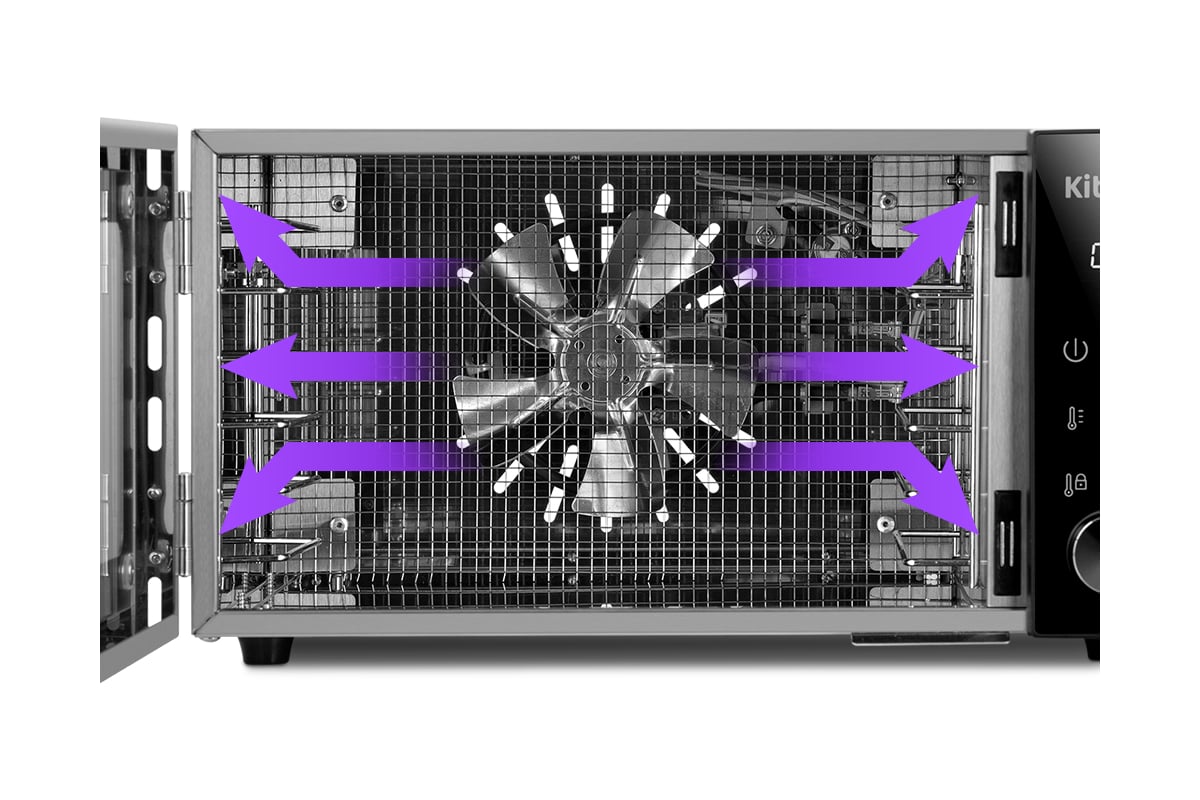 В сушилку установлен мощный нагревательный элемент и вентилятор, обеспечивающий равномерное распределение нагретого воздуха по всему объему камеры. Благодаря горизонтальному обдуву смешение запахов при одновременной сушке разных продуктов минимально.