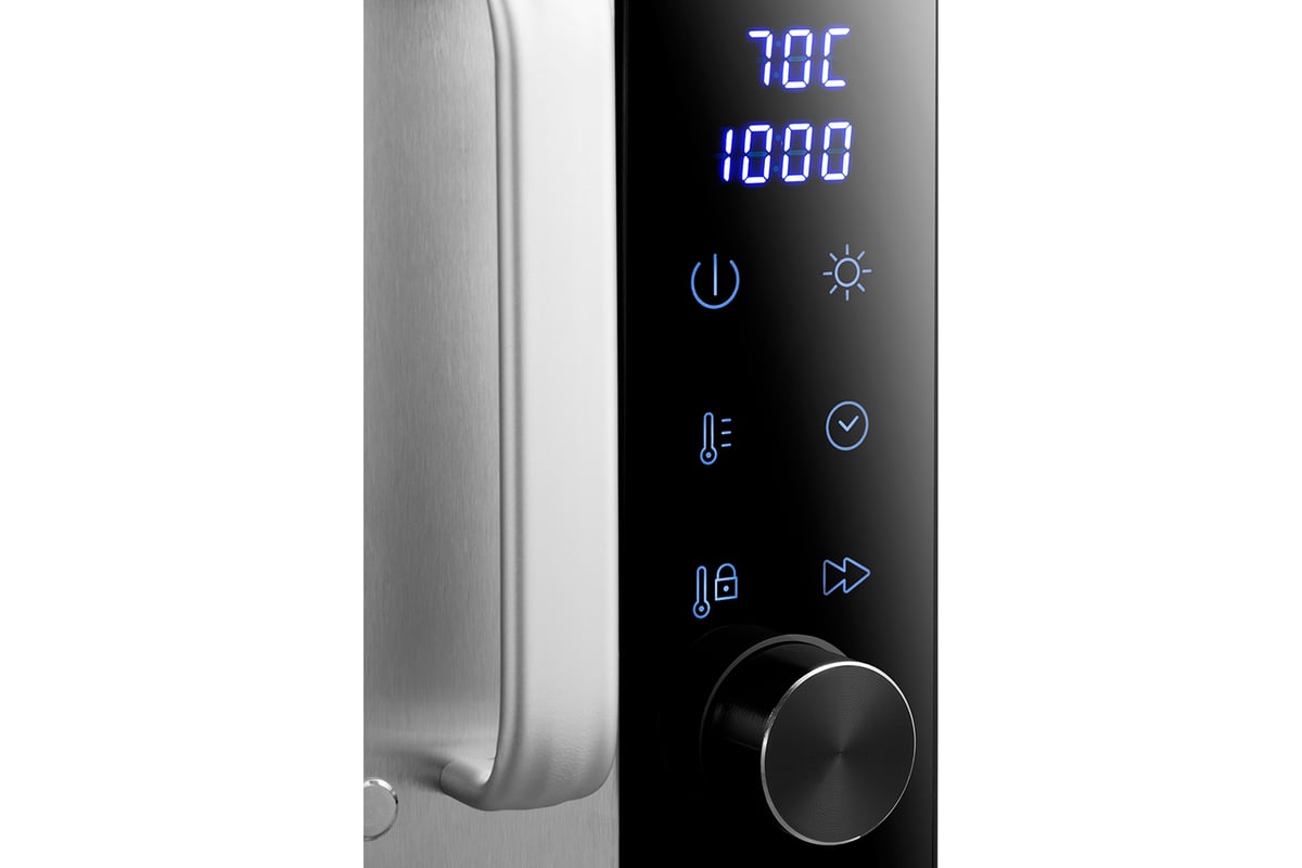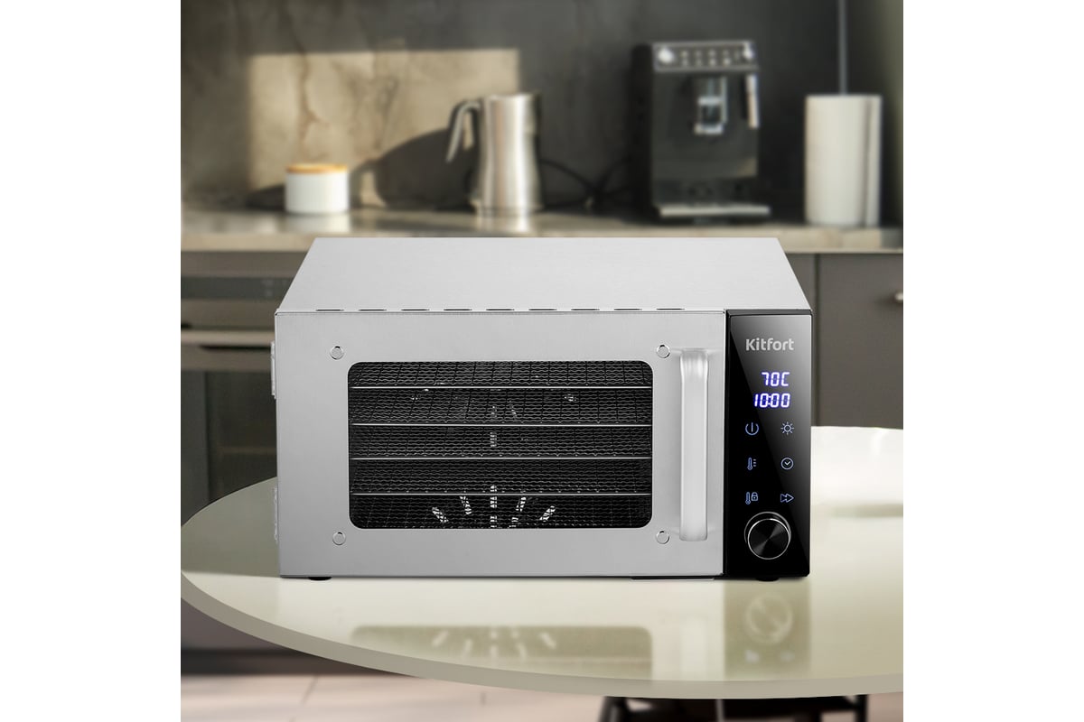 Температуру сушки можно изменить от 35 до 75 °С с шагом 5 °С. Сушилка оснащена таймером от 30 минут до 24 часов работы с шагом 30 минут.