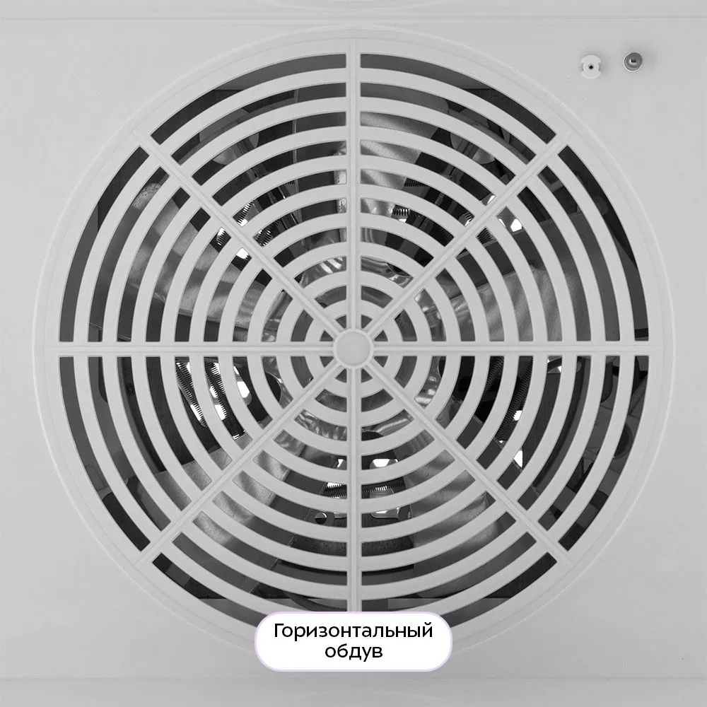 В сушилке установлен нагревательный элемент, а также вентилятор, обеспечивающий равномерное распределение нагретого воздуха по всему объему камеры. Благодаря горизонтальному обдуву смешение запахов при одновременной сушке разных продуктов минимально