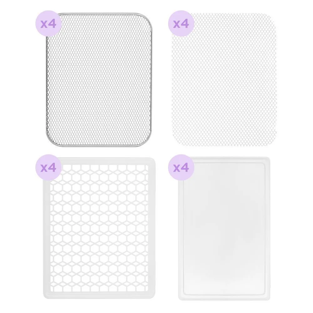 В комплект входят 16 поддонов. Сетки используются для небольших продуктов: травы и ягоды. Металлические и пластиковые поддоны подходят для большинства типов продуктов. Сплошные поддоны служат для сушки водянистых фруктов и овощей, где много сока