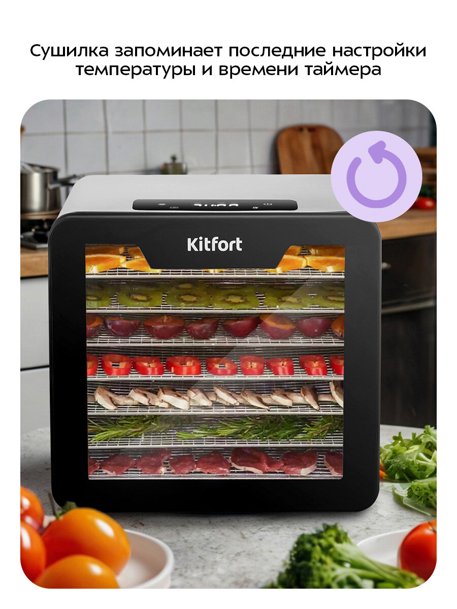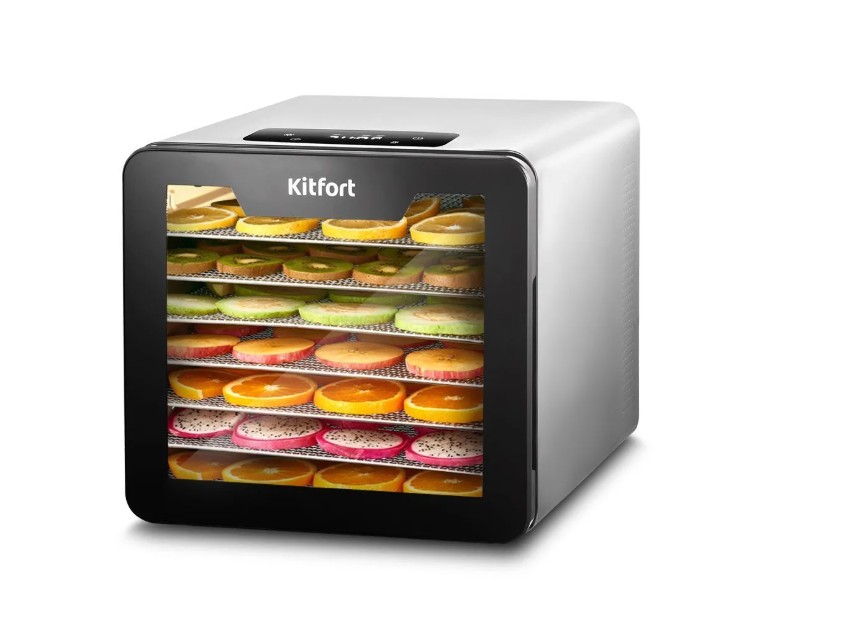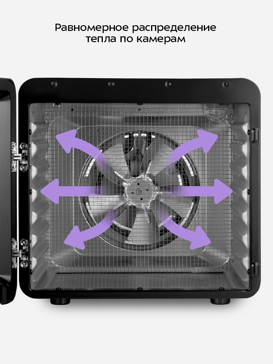 Дегидратор оснащён мощным нагревателем и вентилятором, создающим равномерный горизонтальный обдув по всей камере. Это гарантирует одинаковую сушку продуктов и минимальное смешение запахов при одновременной обработке разных ингредиентов.