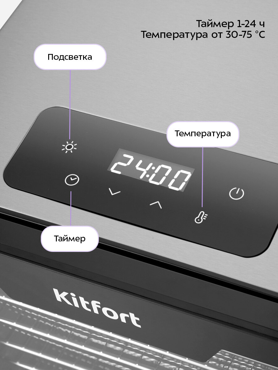Температуру сушки можно изменить от 30 до 75 °C с шагом 5 °C. Сушилка оснащена таймером от 1 до 24 часов работы с шагом 30 минут. Подсветку камеры сушилки можно включать и выключать во время сушки.