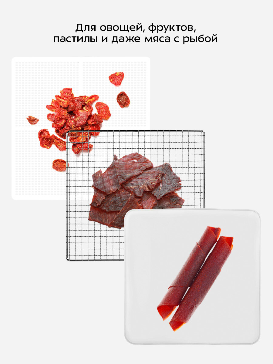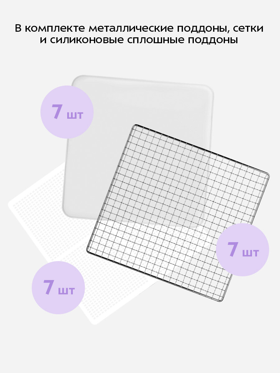 Сушилка комплектуется 7 металлическими, 7 сетчатыми и 7 силиконовыми поддонами, а также поддоном для жидкости. Он собирает сок и крошки во время сушки — просто извлеките и промойте его. Это защищает дно камеры от загрязнений, облегчая уход за устройством.