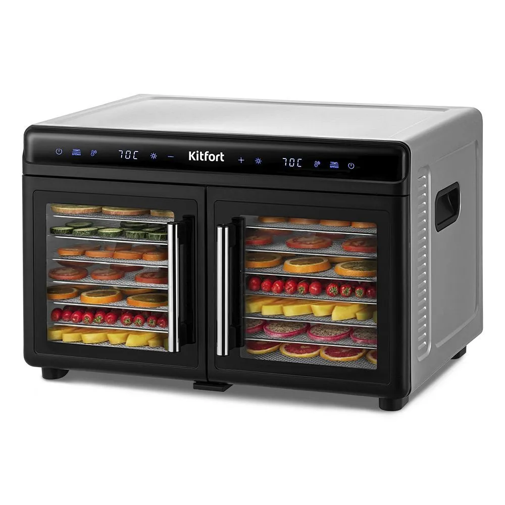 Электрическая сушилка для овощей и фруктов КТ-4962 предназначена для сушки овощей, фруктов, ягод, грибов, корнеплодов, трав и зелени, а также мяса и рыбы, хлеба. С помощью специальных сплошных пластиковых поддонов можно готовить пастилу