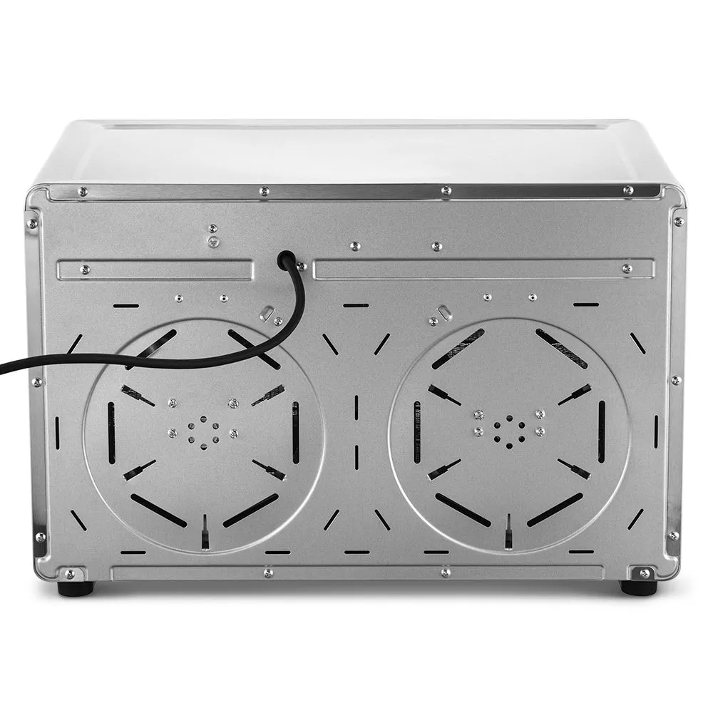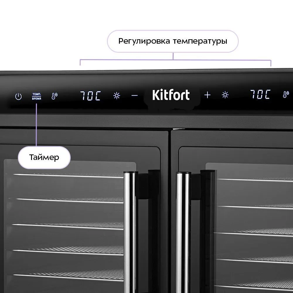 Температуру сушки можно настроить от 35 до 80 °С с шагом 5 °С. Сушилка оснащена таймером от 30 минут до 48 часов работы с шагом 30 минут. Встроенный режим холодного воздуха позволяет довести продукты до готовности без пересушивания.