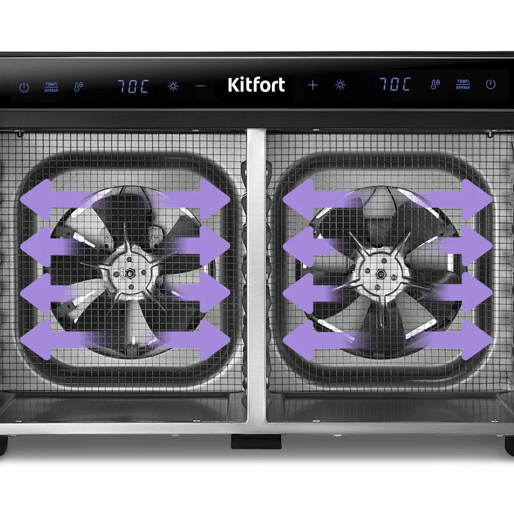 В сушилку установлены мощные нагревательные элементы и два вентилятора, обеспечивающих равномерное распределение воздуха по всему объёму камер. Благодаря горизонтальному обдуву смешение запахов при одновременной сушке разных продуктов минимально.