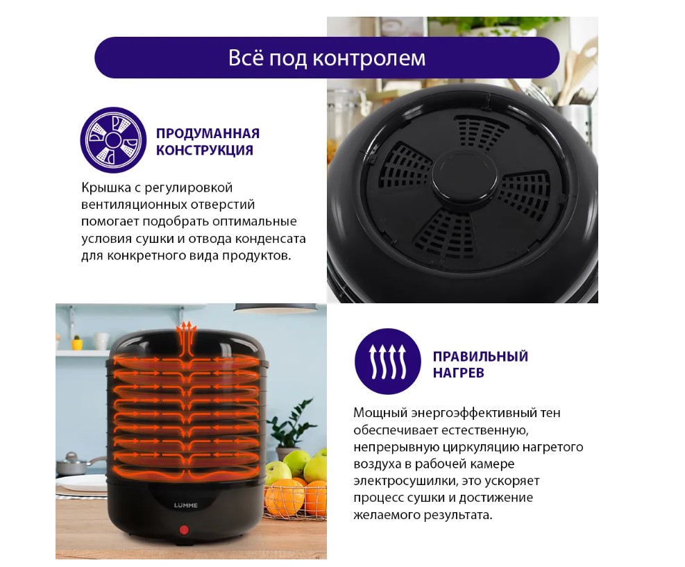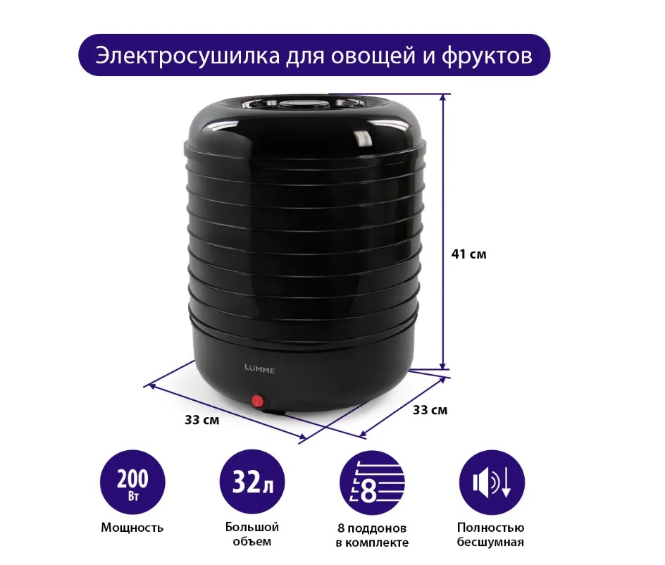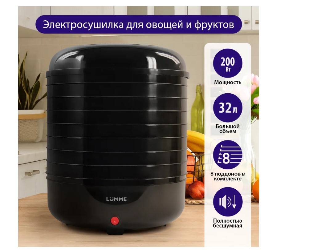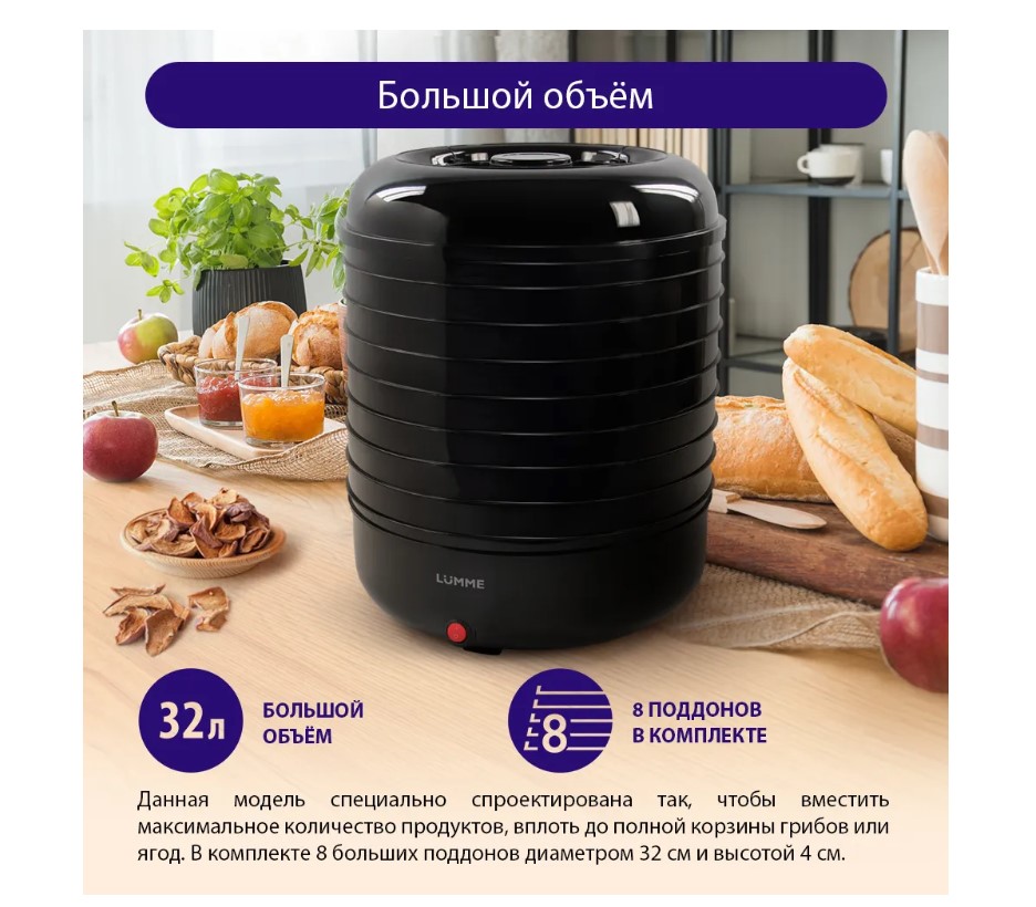 Восьмиуровневая электросушилка с тремя дополнительными поддонами для равномерной сушки трав, зелени, овощей, фруктов, орехов, грибов, приготовления вяленого мяса, птицы, рыбы. Корпус и поддоны сушилки изготовлены из пищевого термостойкого пластика, устойчивого к высоким температурам, не выделяющего вредных веществ и посторонних запахов, сохраняющего вкус и аромат продуктов натуральными. Многоярусная конструкция электросушилки позволяет разместить в небольшом объеме максимум продуктов и добиться их наилучшего распределения для быстрого и равномерного высушивания. Бесшумная работа электросушилки не нарушит домашнего комфорта, а энергосберегающий режим позволит при этом сэкономить электроэнергию. Электросушилка – необычайно полезный прибор, поскольку способен на долгое время сохранить питательную ценность многих сезонных продуктов, обеспечив здоровое питание на весь год.