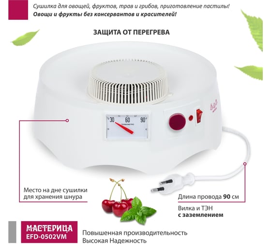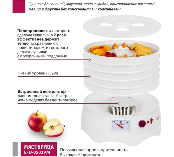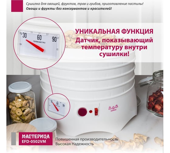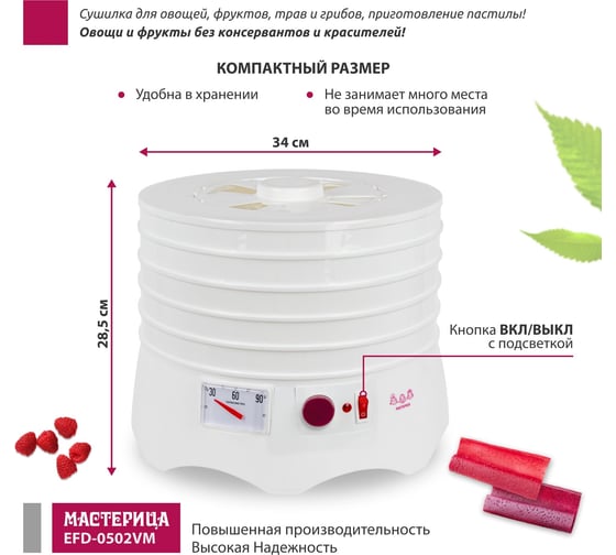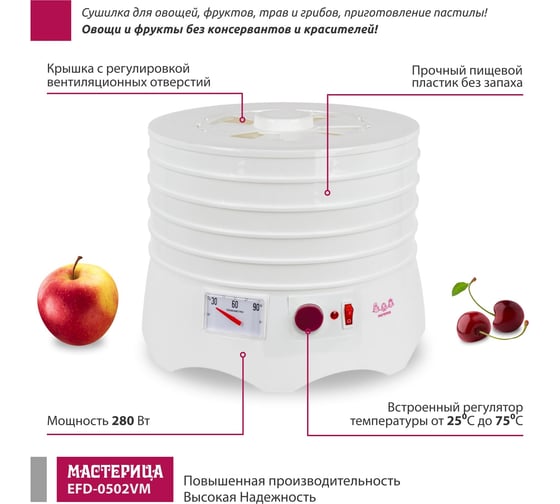 Сушилка для овощей и фруктов Мастерица EFD-0502VM с конвекцией. Мощность 280Вт. 5 белых прочных поддонов + 1 поддон для пастилы. Биметаллический термометр показывает температуру сушки. Крышка с регулировкой вентиляционных отверстий, регулятор температуры от 25 до 75 градусов Световой индикатор работы. Позволяет сушить фрукты, овощи, грибы, мясо, рыбу, травы, а также делать пастилу и десерты. Материал изготовления: пластик РР05. Диаметр поддона 316 мм. Высота поддона 32 мм. Вес 3 кг.