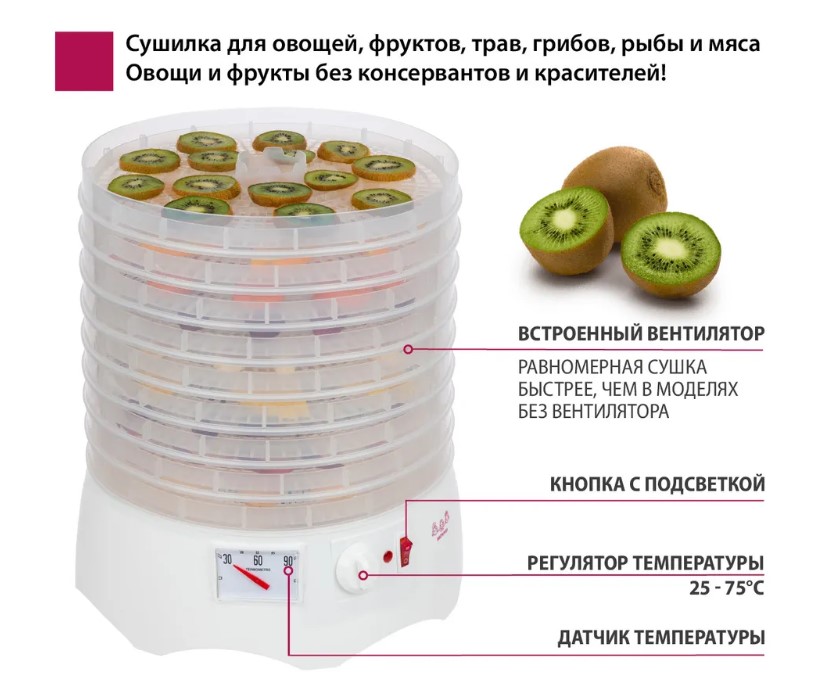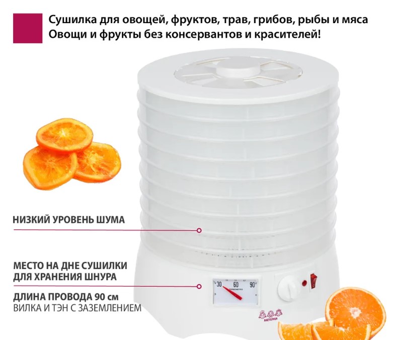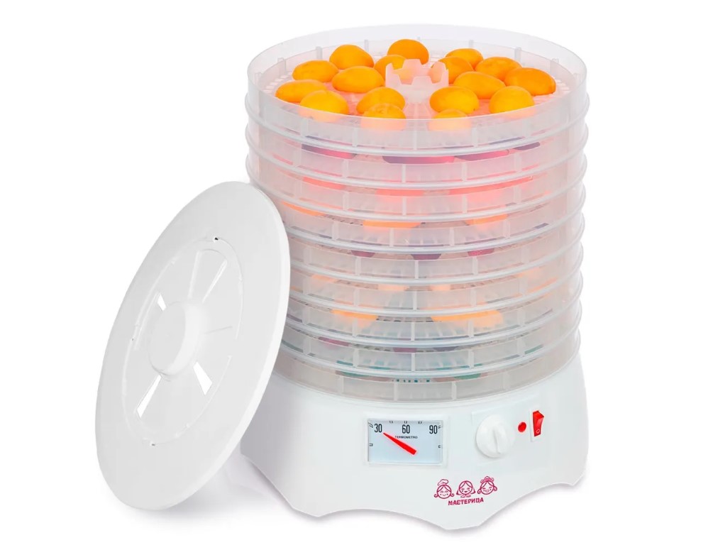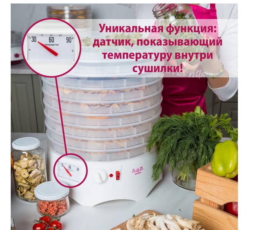 Сушилка для овощей и фруктов Мастерица 6 прозрачных поддонов + 3 белых поддона в подарок. Мощность 280Вт, 9 поддонов, Биметаллический термометр показывает температуру сушки.