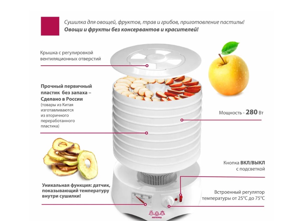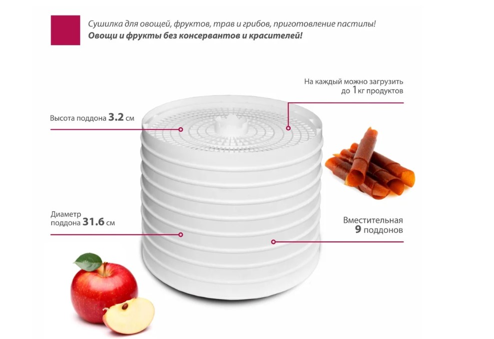 Сушилка для овощей и фруктов Мастерица EFD-0903VM + 2 поддона д/пастилы и лопатка для разравнивания.