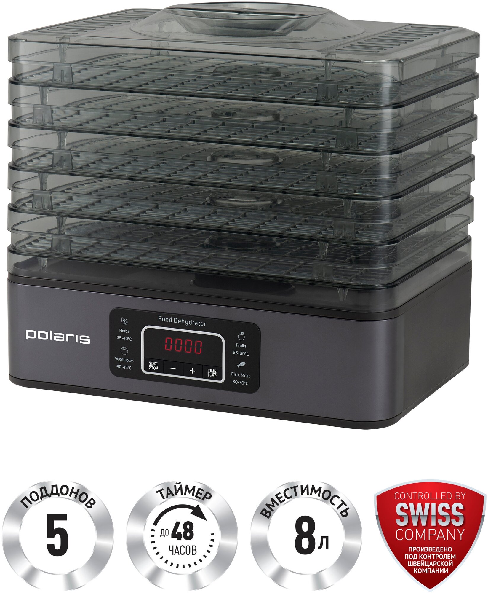 Регулировка температуры от 35° до 70° С, таймер от 30 минут до 48 часов.