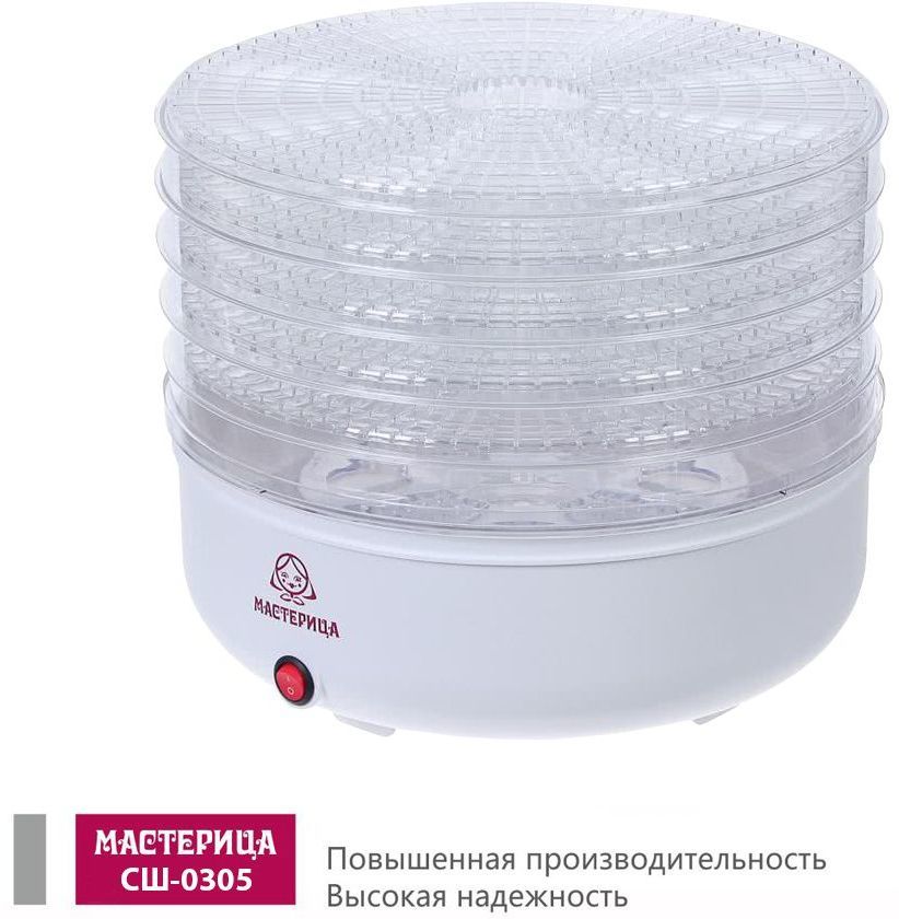 Дополните свою кухню сушилкой для овощей и фруктов МАСТЕРИЦА СШ-0305 с нагрузкой на поддон до 1 кг. Представленная модель практична и удобна в использовании. Все 5 поддонов и корпус прозрачны, а значит, вы сможете контролировать процесс сушки. Низкий уровень шума позволяет оставить сушилку в рабочем состоянии на ночь: утром у вас будут вкусные овощи и фрукты. В комплекте с сушилкой идет вся документация, поэтому вы быстро разберетесь, как пользоваться устройством.