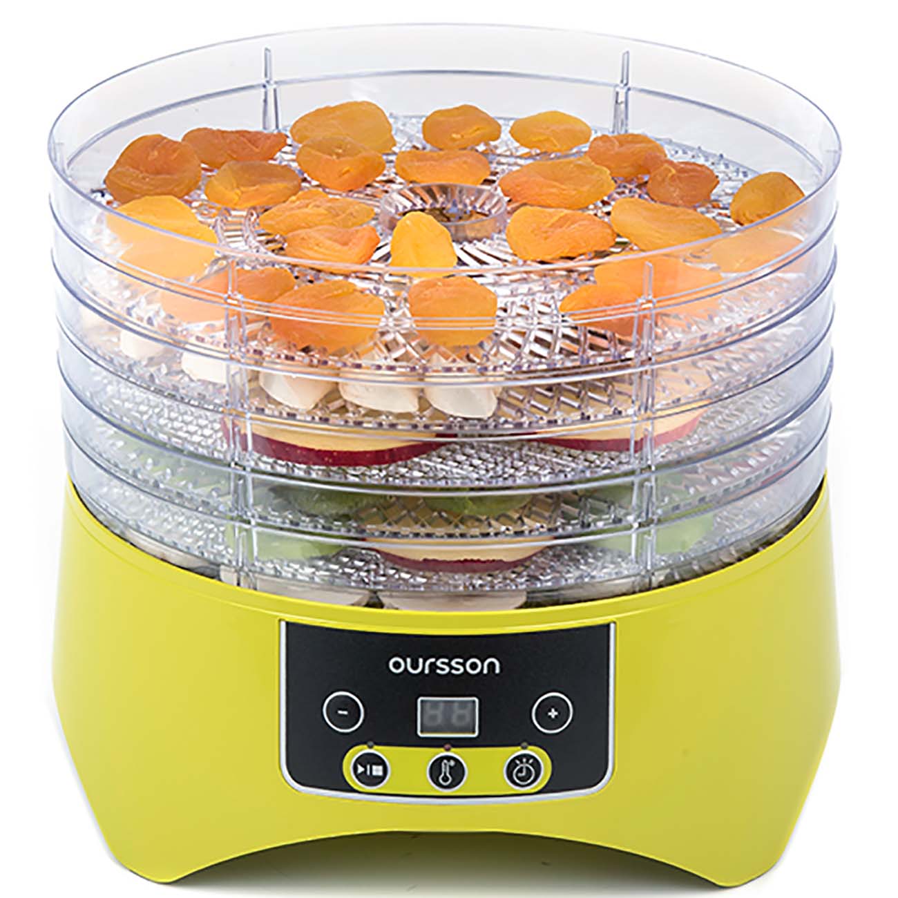 Дегидратор Oursson DH2302D – это электро-бытовой прибор, который поможет прекрасно справиться c заготовкой овощей, фруктов, грибов, вялением мяса или рыбы. Простое управление поможет выставить правильную температуру 38/48/58/68°С и время до 12 часов. Прибор изготовлен из безопасного BPA Free ABS пластика, имеет 6 вместительных лотка для сушки. Во время сушки или вяления из фруктов, овощей, мяса или рыбы испаряется излишняя влага, при этом сама структура клеток остается в целости, продукты сохраняют свой природный, естественный цвет, вкус и аромат, витамины, микроэлементы и ферменты.