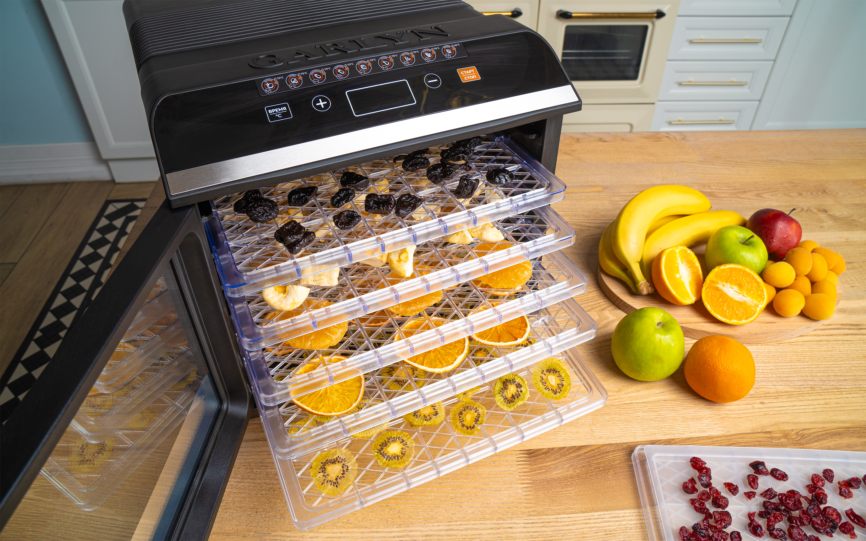 Сушилка электрическая для овощей и фруктов - 1 шт.; Поддон для овощей и фруктов - 6 шт.; Поддон для приготовления пастилы - 6 шт.; Сетка для сушки трав - 6 шт.; Руководство пользователя - 1 шт.; Краткая инструкция пользователя - 1 шт.