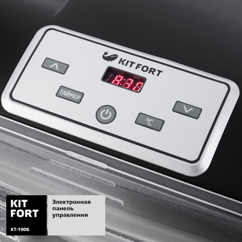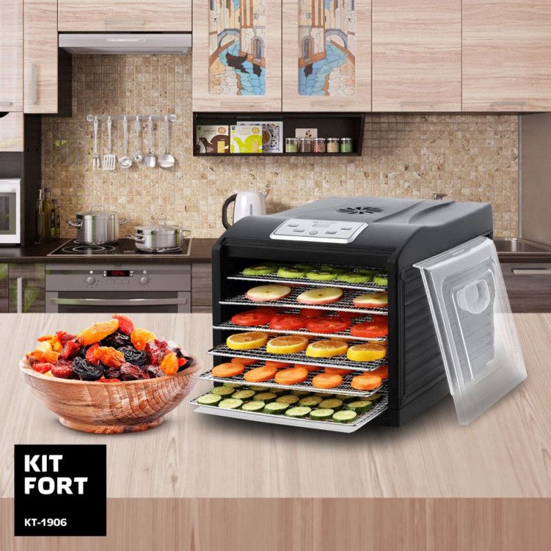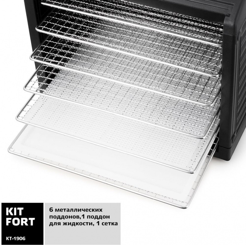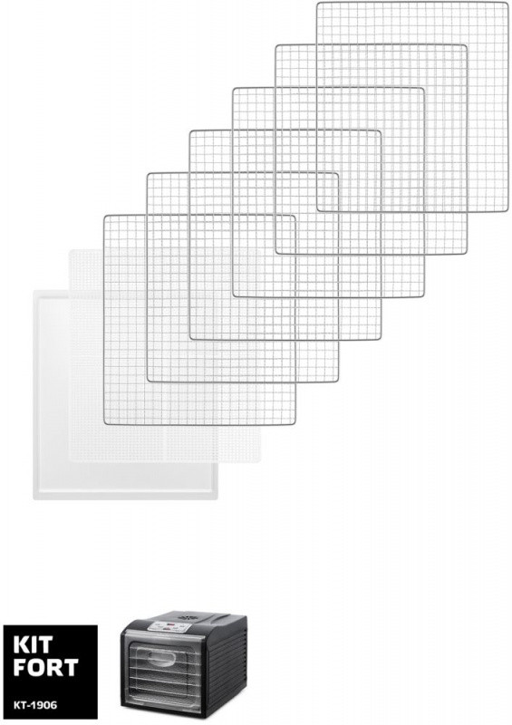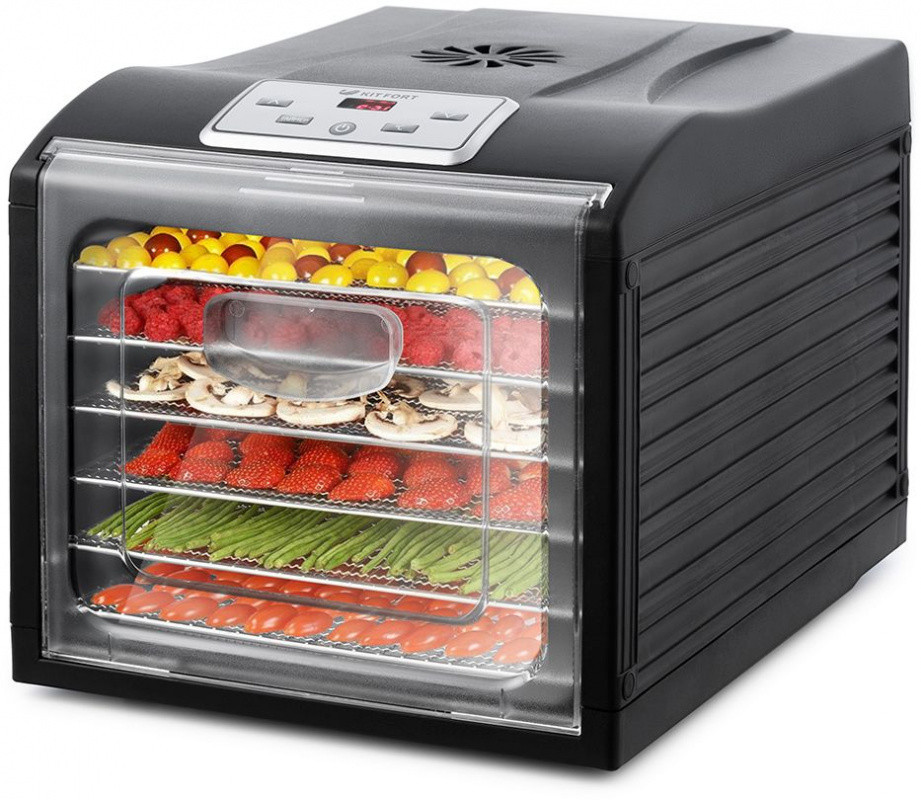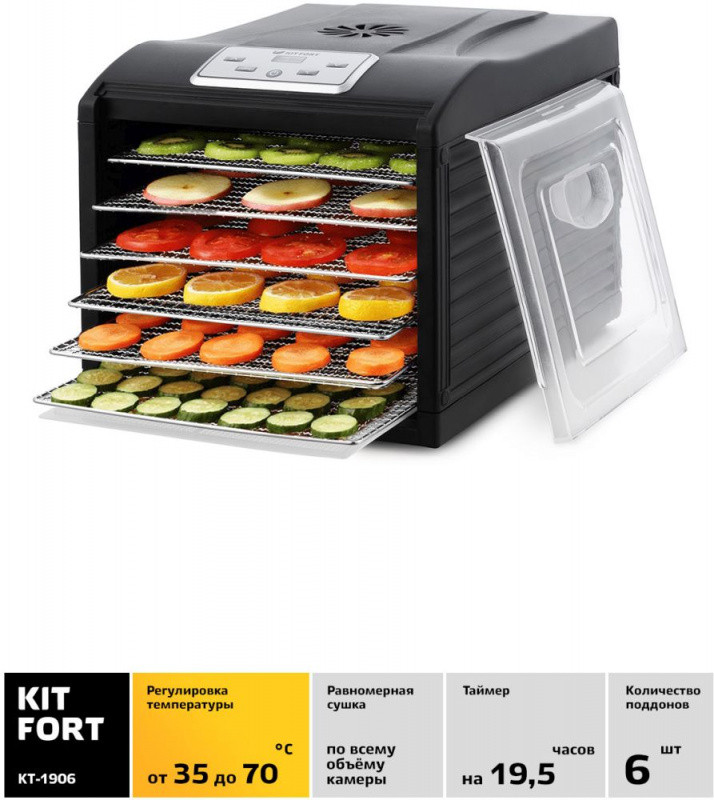 Особенности: 6 поддонов из нержавеющей стали; 6 поддонов для жидкости; 6 сеток для мелких продуктов; горизонтальный обдув; низкий уровень шума; защита от перегрева; электронное управление; регулировка температуры; таймер до 19,5 часов с шагом 30 минут; температура сушки: 35-70 °С с шагом 5 °С