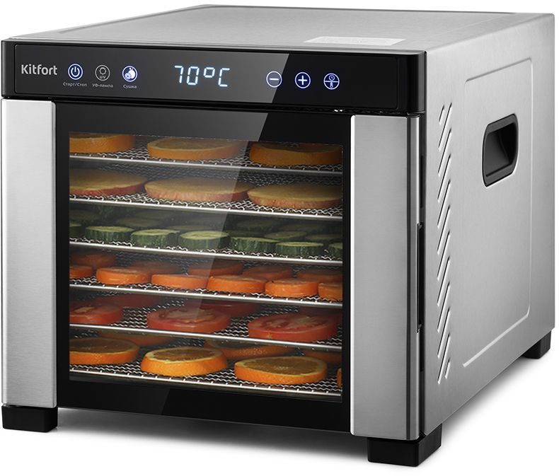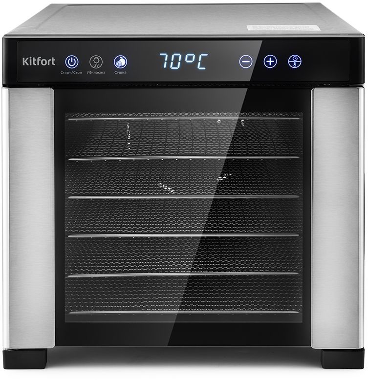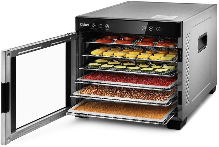 Вместительная электрическая сушилка Kitfort КТ-1916 предназначена для сушки овощей, фруктов, ягод, грибов, корнеплодов, трав и зелени, а также мяса и рыбы, хлеба. С помощью специальных сплошных поддонов можно готовить пастилу.