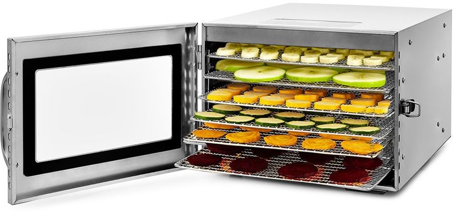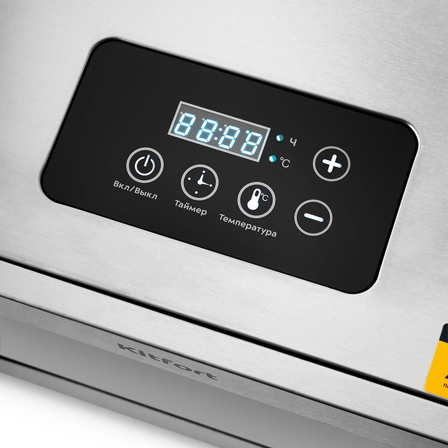 На сушилке можно установить температуру сушки в диапазоне 30-90 °C с шагом 1 °C. Прибор также оснащён таймером до 24 часов работы с шагом 30 мин. Выбранные настройки отображаются на LED-дисплее. Их можно менять в процессе сушки, не прерывая работу.