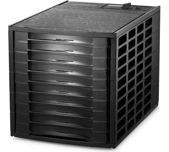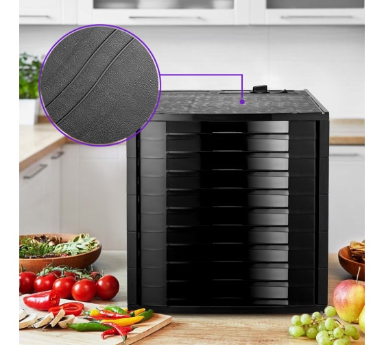 В сушилке установлен мощный нагревательный элемент и вентилятор с лопостями большого диаметра. Это обеспечивает равномерный горизонтальный обдув всех 10 поддонов. Таким образом запахи продуктов с разных поддонов не смешиваются.