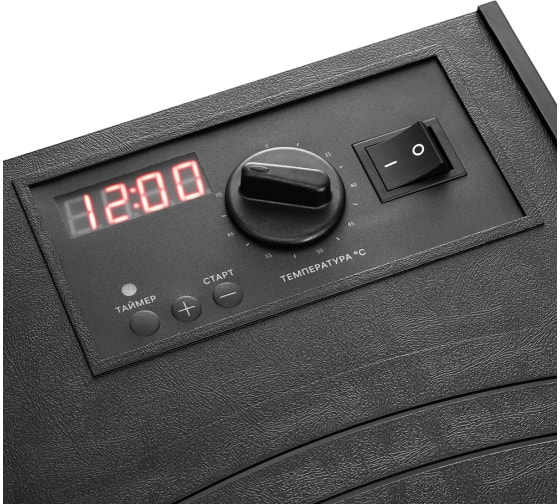 На сушилке можно установить температуру сушки в диапазоне 30–70 °С с шагом 1 °С. У регулятора плавное переключение температуры. Сушилка оснащена таймером до 40 часов 59 мин работы с шагом 1 час.