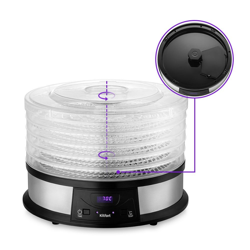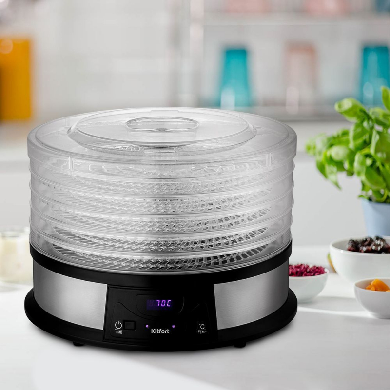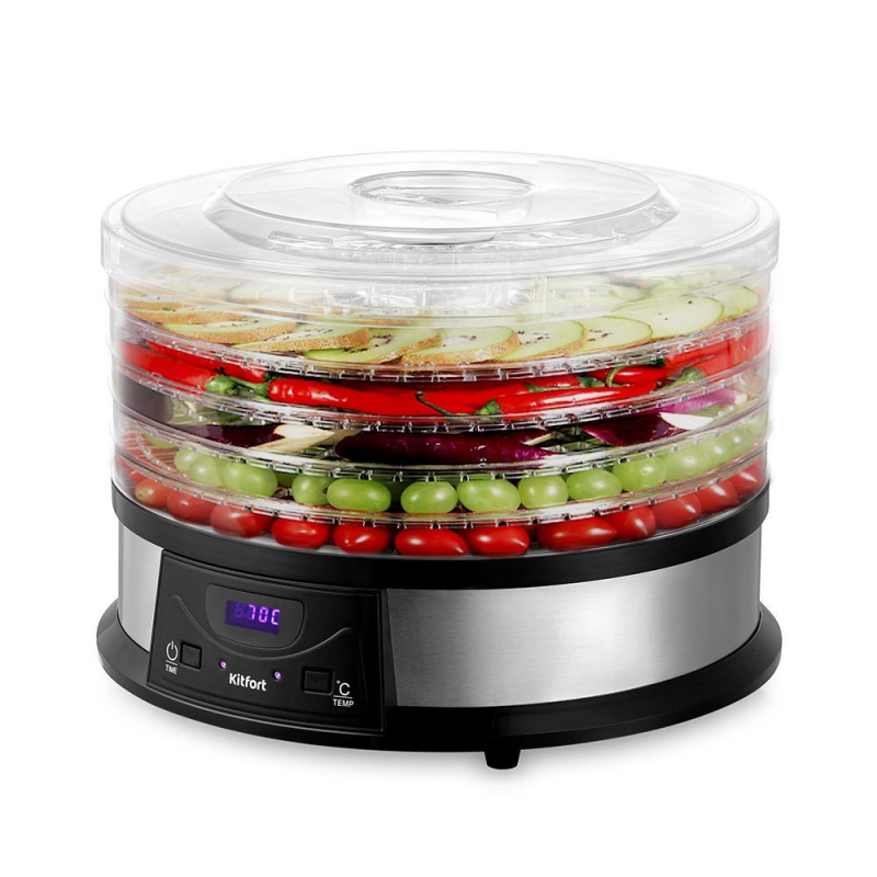 Электрическая сушилка для овощей и фруктов КТ-1931 предназначена для сушки овощей, фруктов, ягод, грибов, корнеплодов, трав и зелени, а также хлеба.
