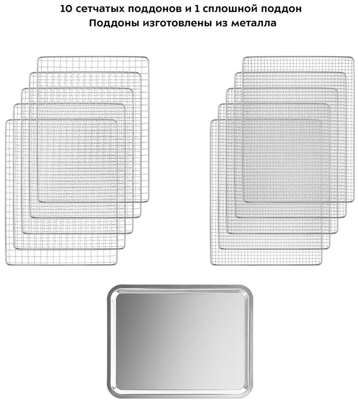 1. Сушилка с установленным фильтром и крышкой фильтра — 1 шт. 2. Поддон — 10 шт. 3. Сплошной поддон – 1 шт. 4. Шнур питания — 1 шт. 5. Руководство по эксплуатации – 1 шт. 6. Коллекционный магнит – 1 шт.* *опциональноЦвет