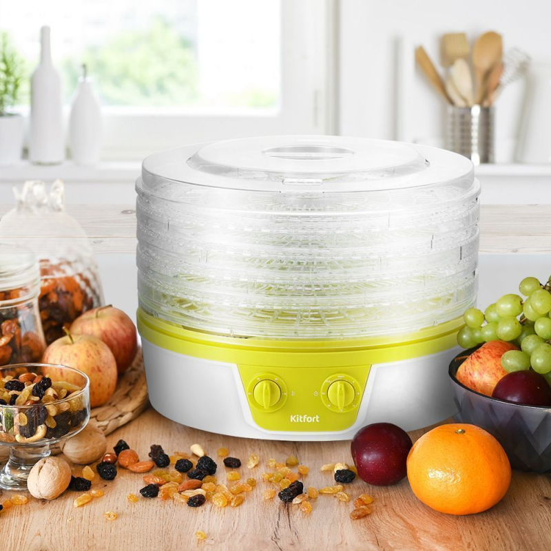 С сушилкой для фруктов и овощей с вращающимися поддонами KT-1935 у вас под рукой будет всегда живая еда. Прибор насушит на всю зиму помидоры, кабачки, баклажаны, клубнику, абрикосы, персики, тыкву, грибы, зелень, хлеб и многое другое.