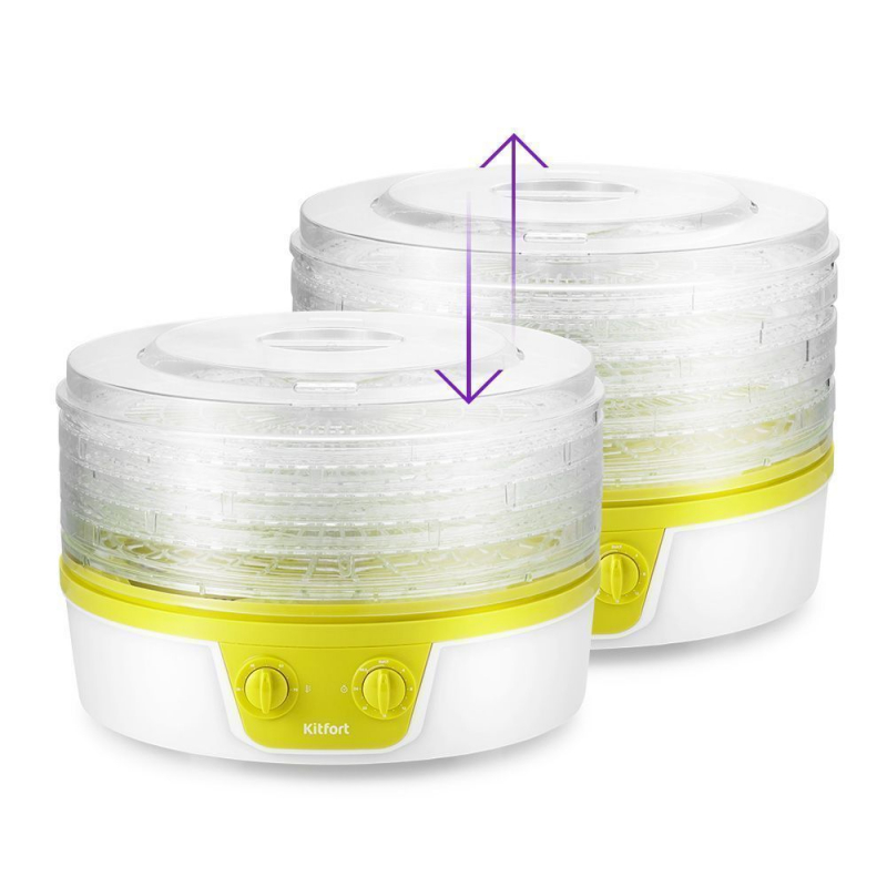 Поддоны можно установить в двух положениях по высоте: компактно и с удвоенной высотой в зависимости от размеров высушиваемых продуктов. Для регулировки расстояния между поддонами каждый поддон имеет выступы по краям сверху и снизу.